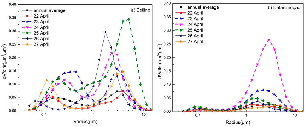 Aerosol products of two AERONET stations located in Beijing (39.977°N, 116.381°E) and Dalanzadgad (43.577°N, 104.419°E) are used in the current work. The Cimel sky radiometer is the standard AERONET instrument used to measure direct sun and diffuse sky radiances within the 340–1020-nm and 440–1020-nm spectral ranges, respectively [37]. An inversion algorithm was used to retrieve the aerosol volume size distributions for radii ranging from 0.05–15 μm, while single scattering albedos were obtained from spectral sun and sky radiance data. To ensure accuracy, only Level 1.5 data (cloud screened) [38] and Level 2.0 data (quality assured) from both direct sun (Aerosol Optical Depth (AOD)) and inversion products (size distribution and SSA) during the dust storm are used. The uncertainty in AOD retrieval under cloud-free conditions was <±0.01 for wavelengths >440 nm and <±0.02 for shorter wavelengths, which is less than the ±5% uncertainty assigned to sky radiance measurements [39]. The retrieval accuracy has been explained fully by Dubovik et al. [40].