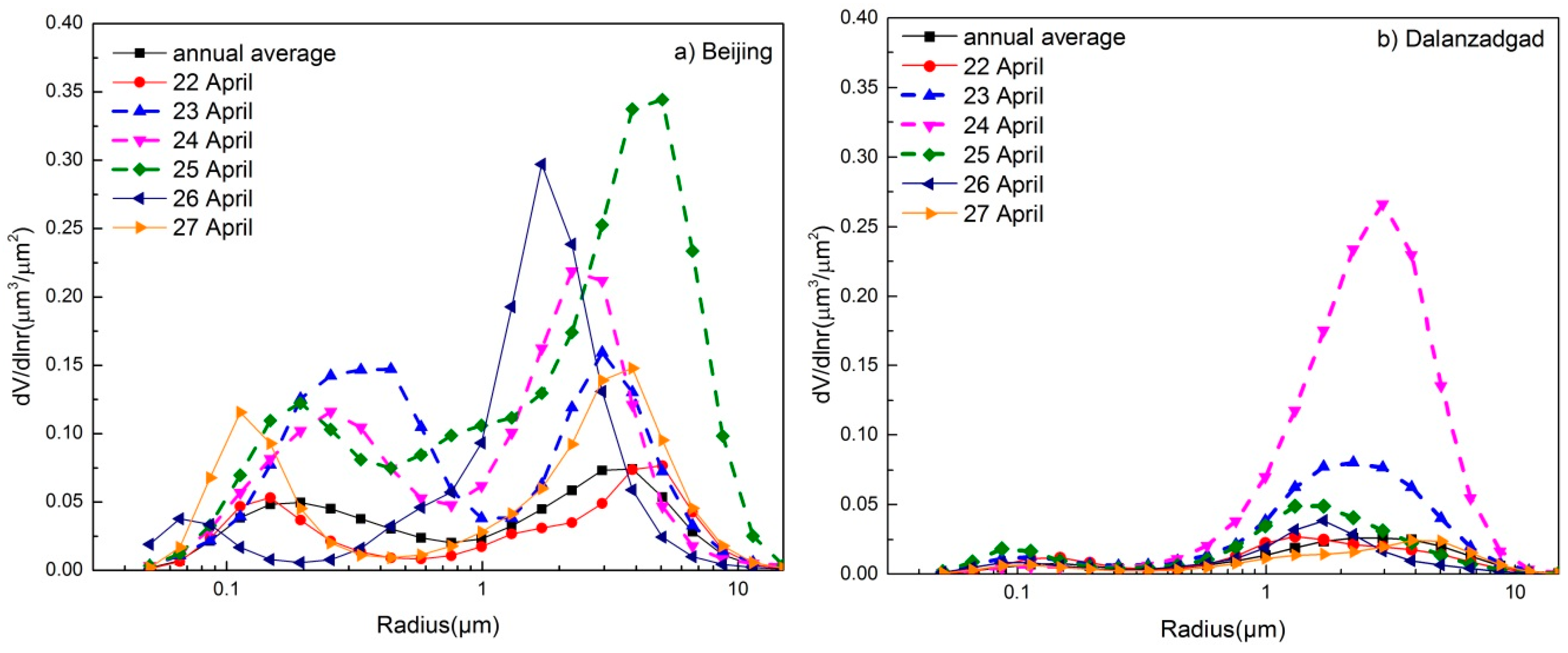 AERONET volume size distributions in (a) Beijing and (b) Dalanzadgad. Curves on the dusty days are represented with dashed lines.