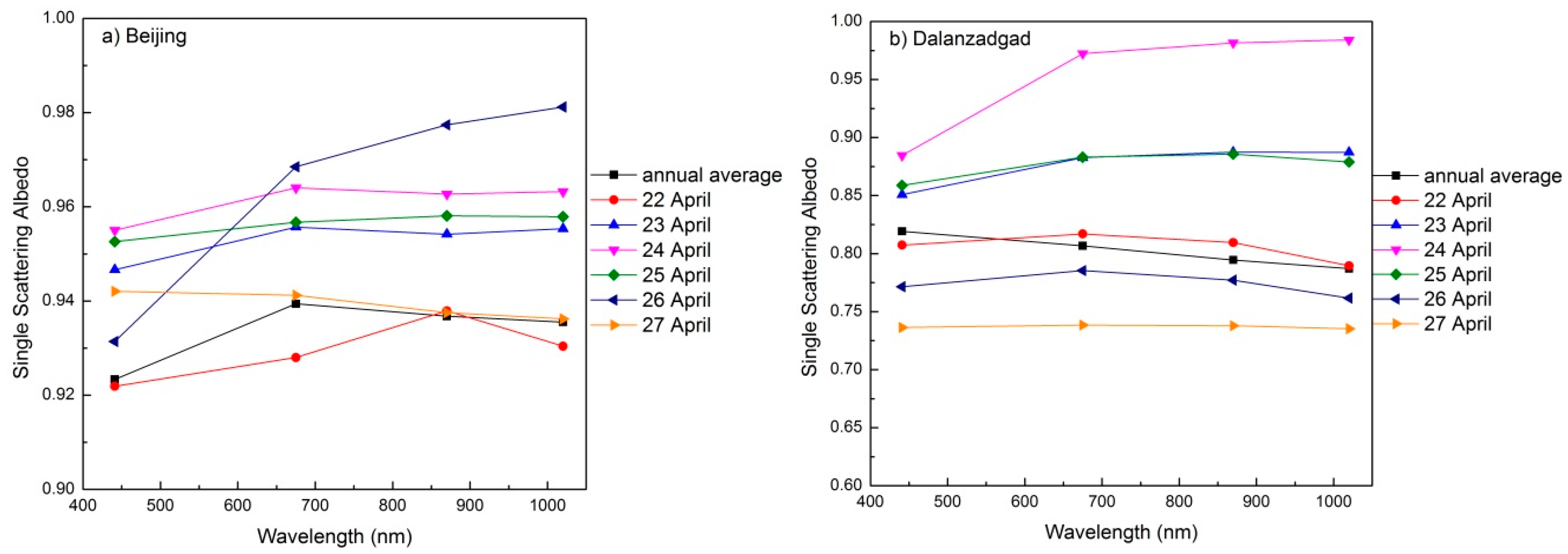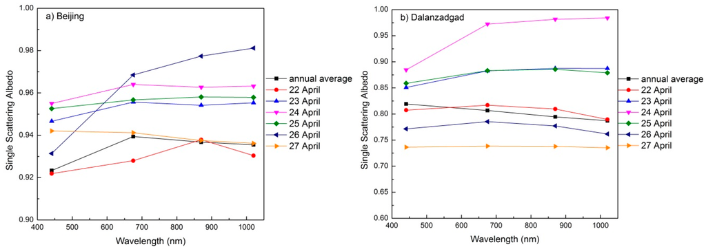 The spectral SSA variation on 26 April indicates distinct coarse dust particle properties, which show strong absorption at 440 nm and strong scattering at longer wavelengths. The different aerosol properties can be attributed to the strong northerly wind, dissipation of the high fine dust aerosol loading and the introduction of coarse dust particles from northeast China. On 27 April, as the local anthropogenic fine aerosols and the deposition of coarse particles increased, the spectral SSA decreased with wavelength, which was similar to the annual average in Dalanzadgad. However, the SSA at each band is larger than 0.93, whereas the SSA at each band is less than 0.82 for the annual average in Dalanzadgad. These data suggest the dominant contribution of fine particles in Beijing with much stronger scattering compared to Dalanzadgad for non-dusty days.