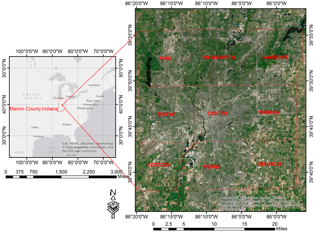 The study area, Marion County (Figure 1), is the county seat of Indianapolis, in the State of Indiana. Marion County is part of the Indianapolis-Carmel-Anderson Metropolitan Statistical Area. Located on a flat plain makes it possible for the city to expand in all directions. Indianapolis was the 14th largest city in the United States by population in 2014. The area lies between latitudes 39°55′37.75″N to 39°37′54.28″N and longitudes −86°19′33.65″W to −85°56′10.11″W. According to the 2010 Census, the total area of Marion County is 1044 km2 of which 98.34% is land and 1.66% is water.