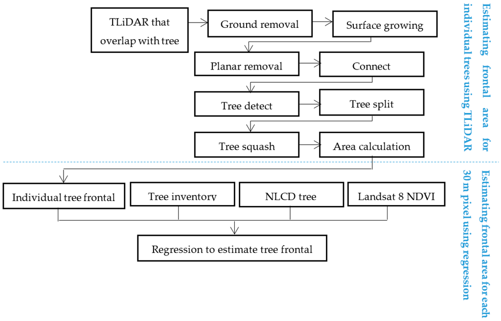 To estimate the frontal areas of urban trees, two steps were taken. First, the frontal areas of individual trees were estimated from Terrestrial LiDAR data. Second, regressions were formed for each tree category to estimate the frontal area per 30 m pixel, and thus the tree frontal area for the whole study area was estimated. Figure 2 shows the workflow, and the following sections describe the method in detail.