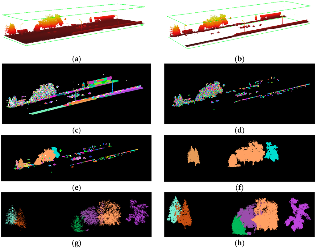Demonstrating the process of individual tree segmentation: (a) the original Terrestrial LiDAR tile; (b) ground removal; (c) surface growing; (d) planar removal; (e) connect components; (f) tree detection; (g) trunk and branch building for individual tree segmentation; and (h) allocating the rest of the points.