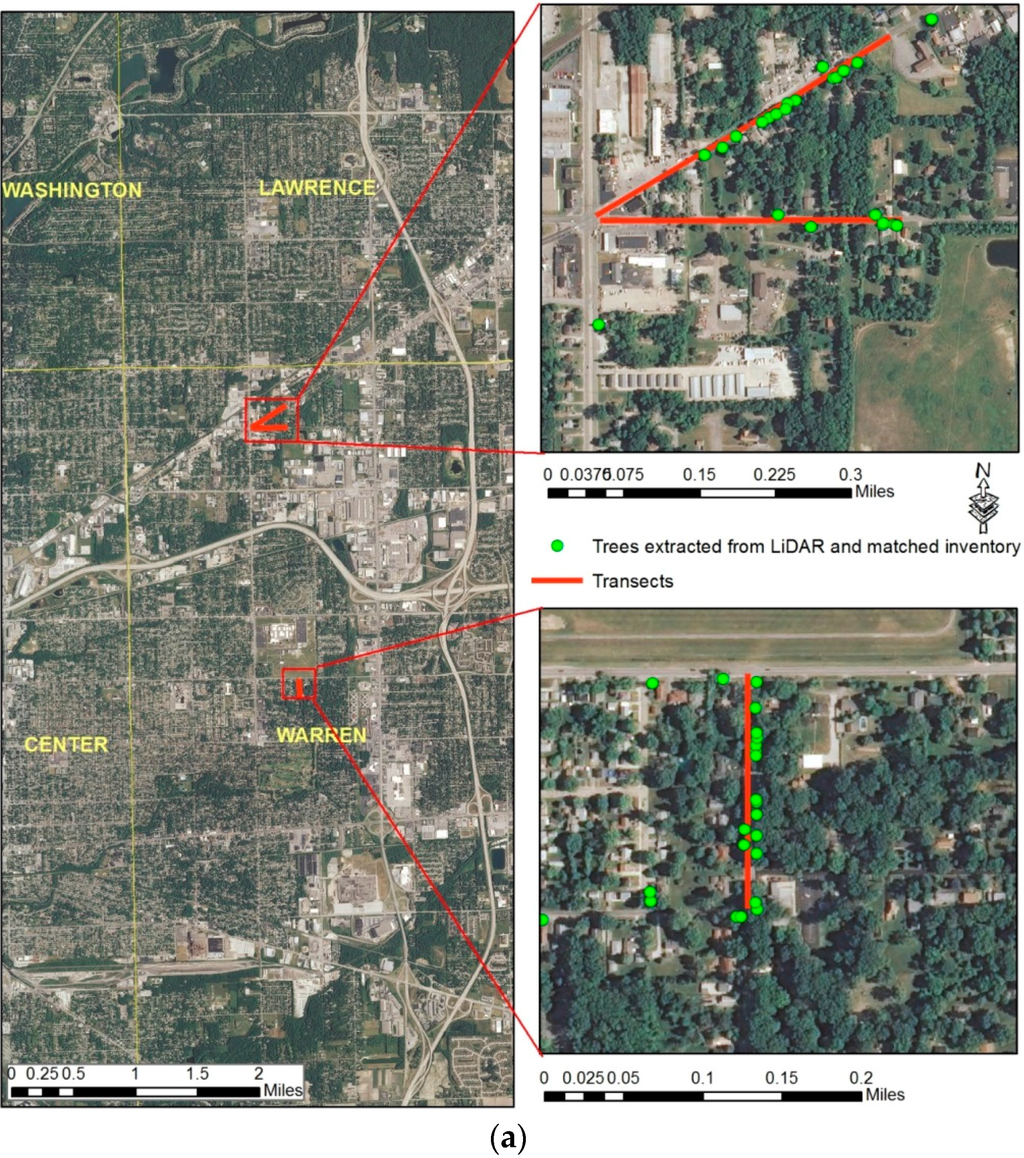 We acknowledge Jim Stout, the former Program Manager of Indianapolis Mapping and Geographic Infrastructure System for providing Terrestrial LiDAR data, Bill Kincius, Manager of Urban Forestry, Department of Public Works, the City of Indianapolis for providing tree inventory data, Robert Neary, Staff Geographer and Project Manager from Keep Indianapolis Beautiful, Inc. (Indianapolis, IN, USA.) for valuable discussion on urban tree growing, and George Vosselman from University of Twente, The Netherland, for providing Point Cloud Mapper. We acknowledge Peng Fu and Yuanfan Zheng from Center for Urban Environmental Change, Indiana State University, for their help in the field work. We also acknowledge the constructive comments from four anonymous reviewers and efficient correspondence from editors.