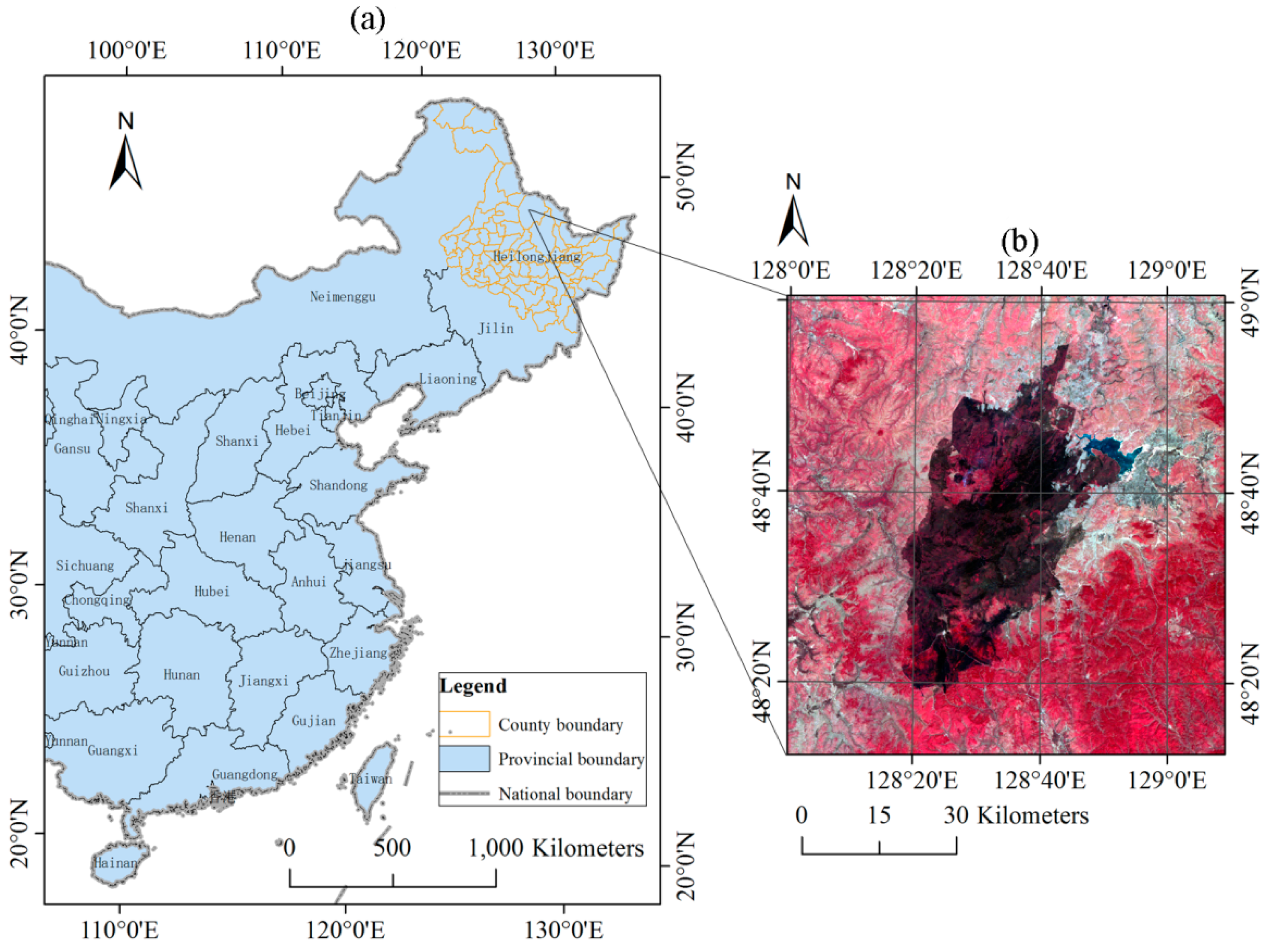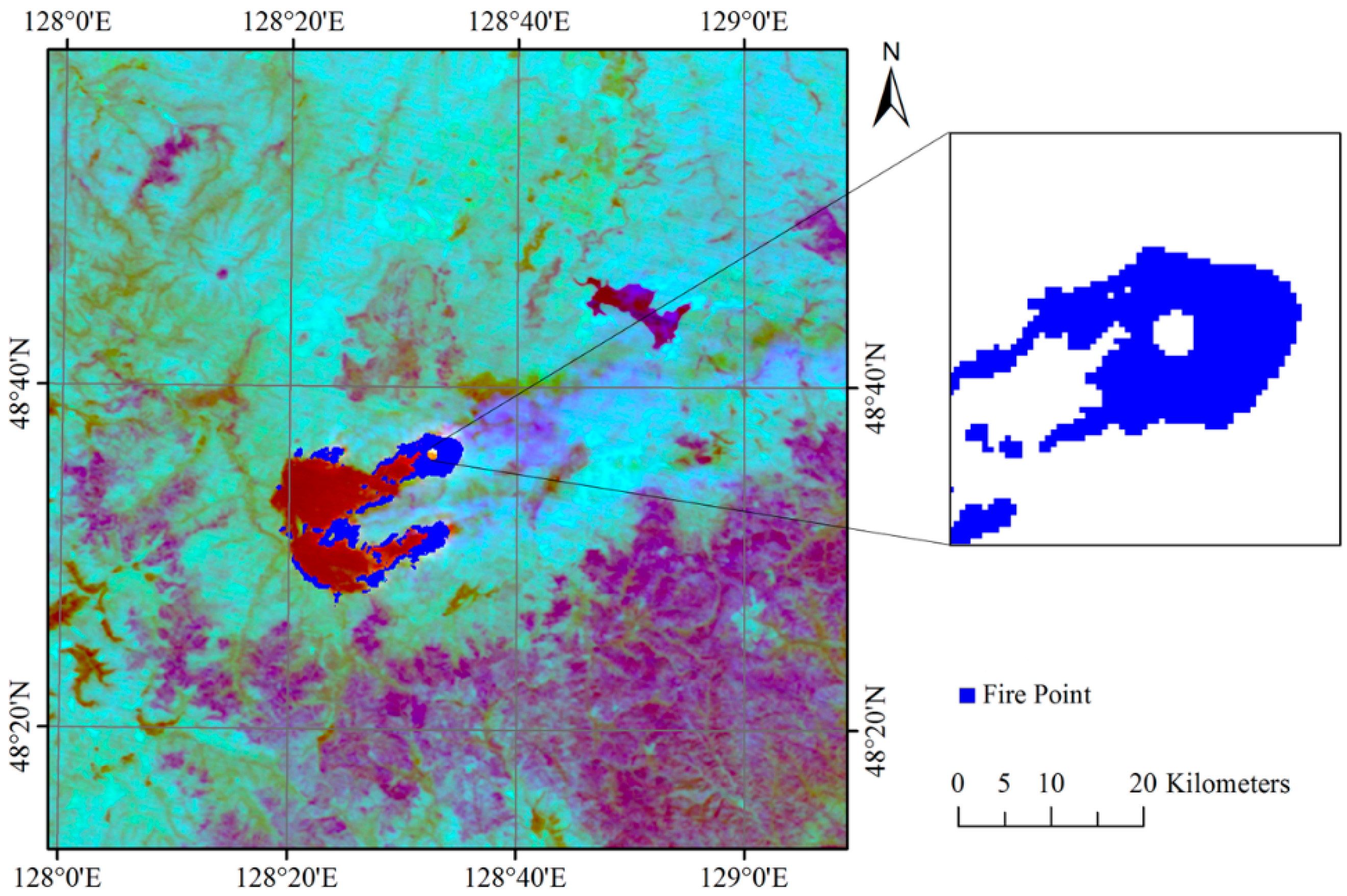 The Yinanhe forest is located in the northern part of Heilongjiang Province, China. The Yinanhe forest belongs to the subtemperate zone and possesses a humid climate, with an average annual temperature of −2 °C, a maximum temperature of 38 °C, and a minimum temperature of −42 °C. The average elevation is 656 m. The vegetation belongs to the Lesser Hinggan flora and primarily includes cold hardy plants. On 27 April 2009, a forest fire broke out in the Yinanhe forest. The fire was located at 48°41′N latitude and 128°12′E longitude (Figure 1).