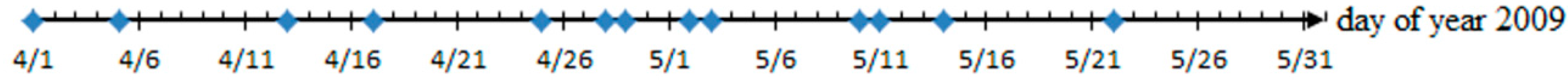 The HJ-1B/IRS data used in this paper include 13 images acquired in 2009. The data were downloaded from the China Centre for Resources Satellite Data and Application website [17]. The temporal distribution of the images is shown in Figure 2, and two BT images from band 7 and band 8 acquired on 22 May 2009 are shown in Figure 3. Although the revisit cycle of HJ-1B is four days, we can obtain two available images over a two-day period because study area is covered in the overlapping region of the two images photographed in different tracks.