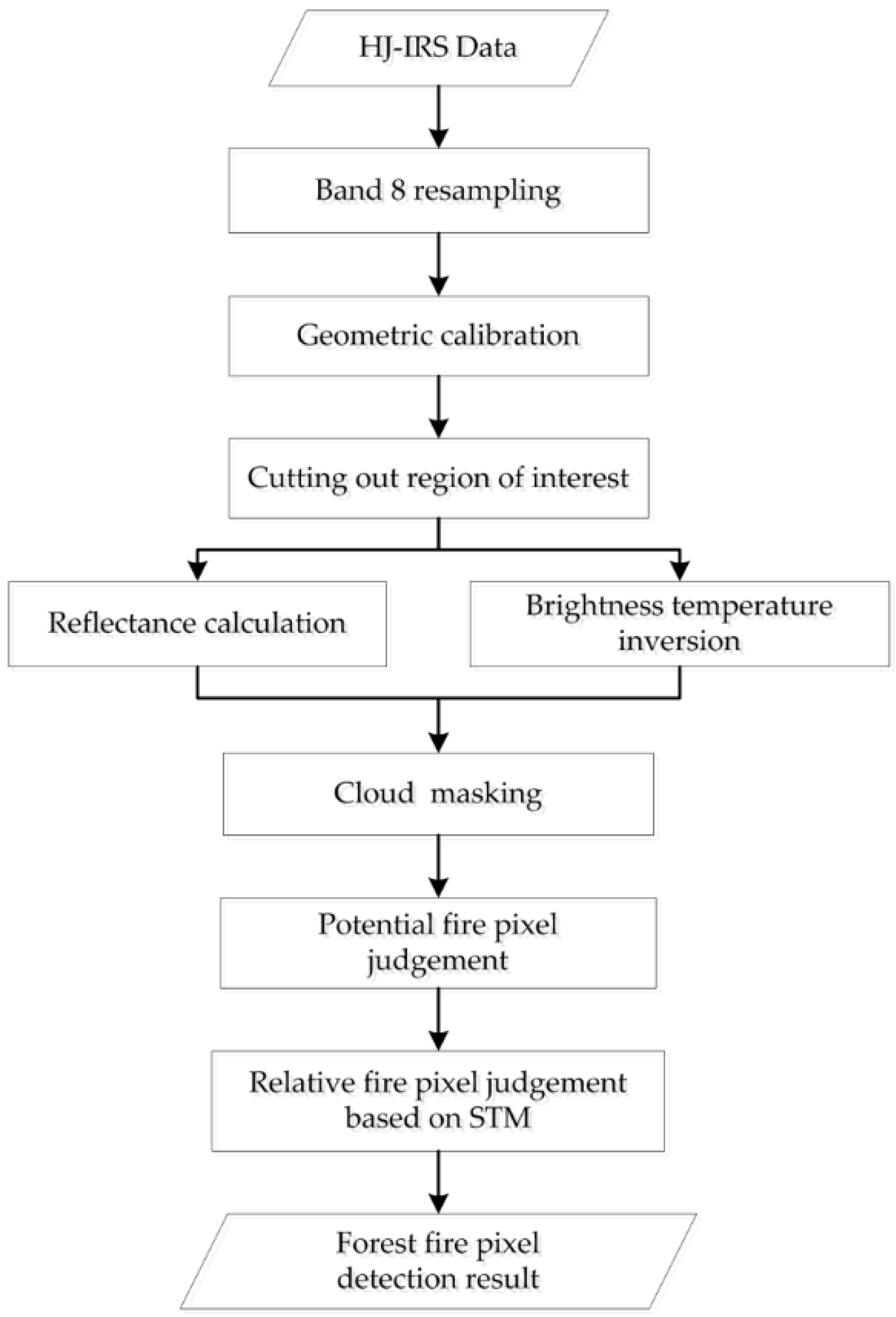 As with the spatial contextual algorithm, the forest fire detection algorithm proposed in this study includes four major steps: data preprocessing, cloud masking, potential fire pixel judgment, and relative fire pixel judgment based on STM. A STM method workflow is illustrated in Figure 6.