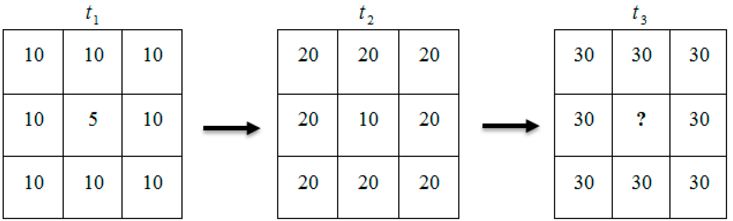In the contextual algorithm, potential fire pixels whose observed BT values were significantly different from the background intensities (predicted BT values) were considered to be actual fire points. Thus, the background BT prediction played an important role in the fire detection. The mean value of the valid neighboring pixels was regarded as the background intensity in the contextual algorithms. However, it was occasionally difficult to use that value to indicate the characteristics of the background because of spatial heterogeneity. For example, the mean value in frame t3 (Figure 7) cannot be taken as the background intensity of the question mark because 15 is a better choice than 30 according to the data distribution in frames t1 and t2. It is obvious that the strong correlations between the center grid and its neighboring grids in frames t1 and t2 are helpful for predicting the background intensity of the center grid in frame t3.