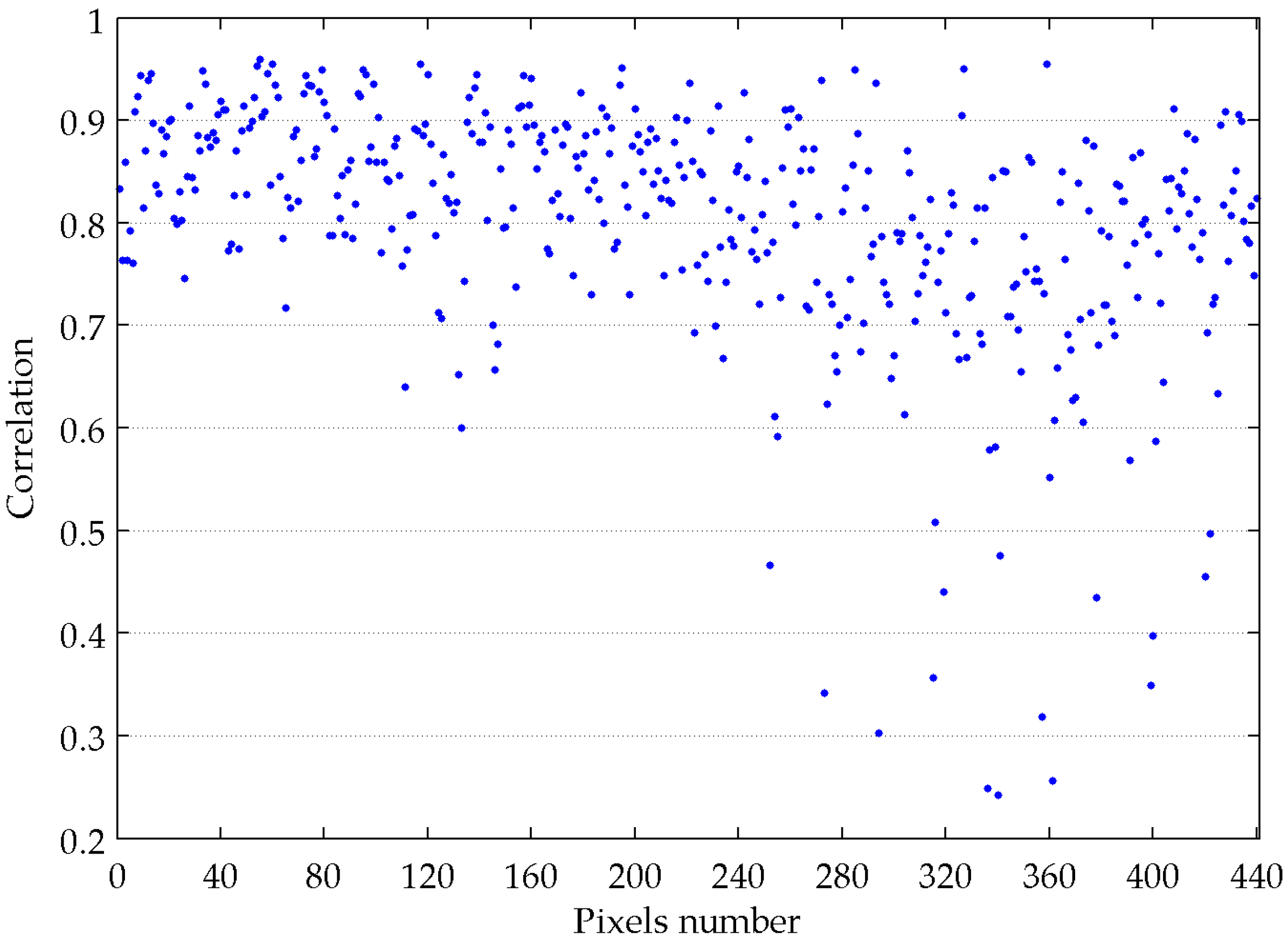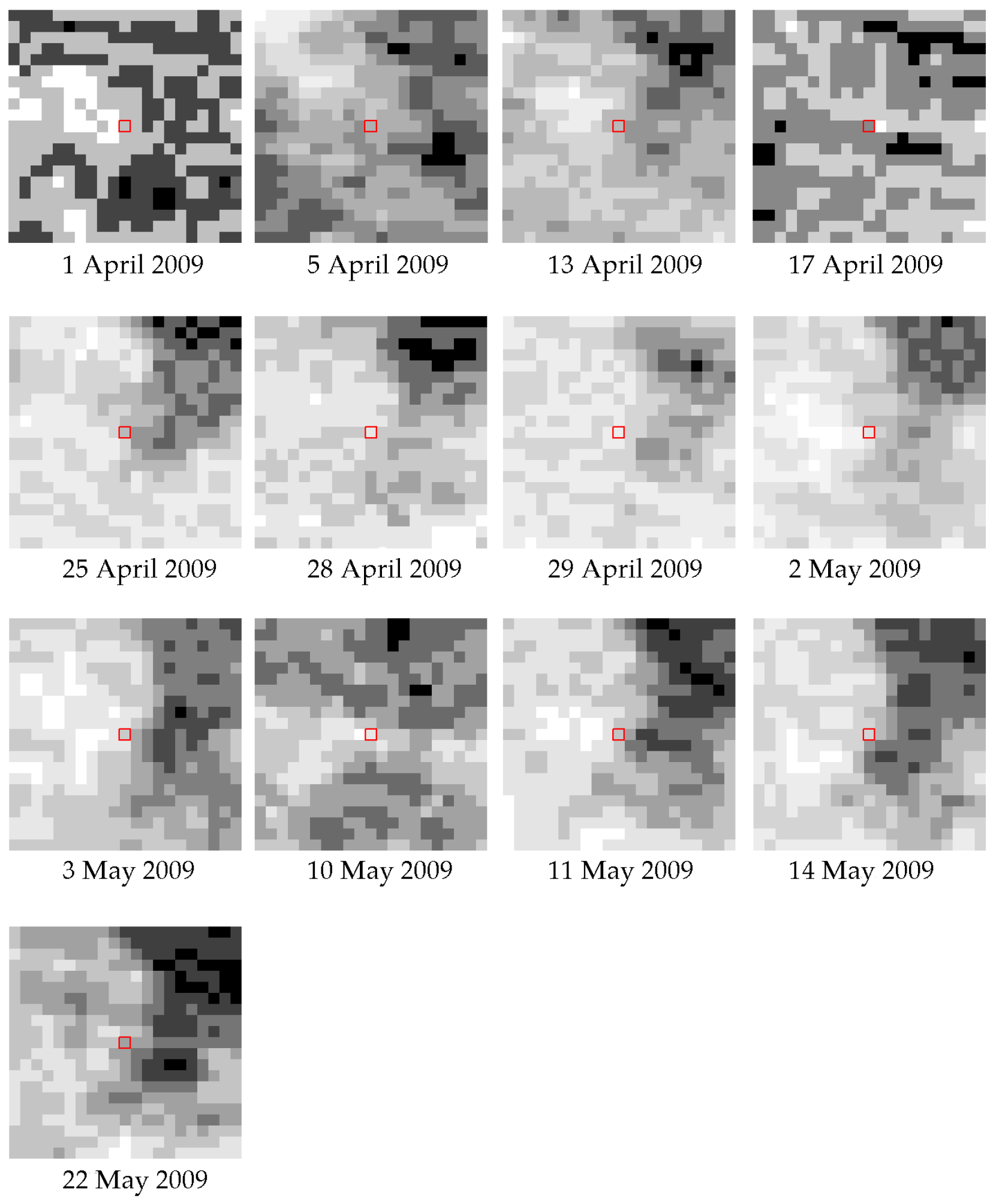 Spatial heterogeneity is a common phenomenon in remote sensing images. Figure 8 shows the BT changes of an inspected pixel and its neighboring pixels over time. The size of each image is 21 × 21, and we had 441 time series with lengths of 13 frames. The correlation coefficients between the inspected time series and the neighboring time series are shown in Figure 9. The mean of the correlation coefficients was 0.8021, which indicates a high correlation. Thus, a spatio-temporal model can be built using the correlation relationship between the pixels to predict the background intensity with multi-temporal images.