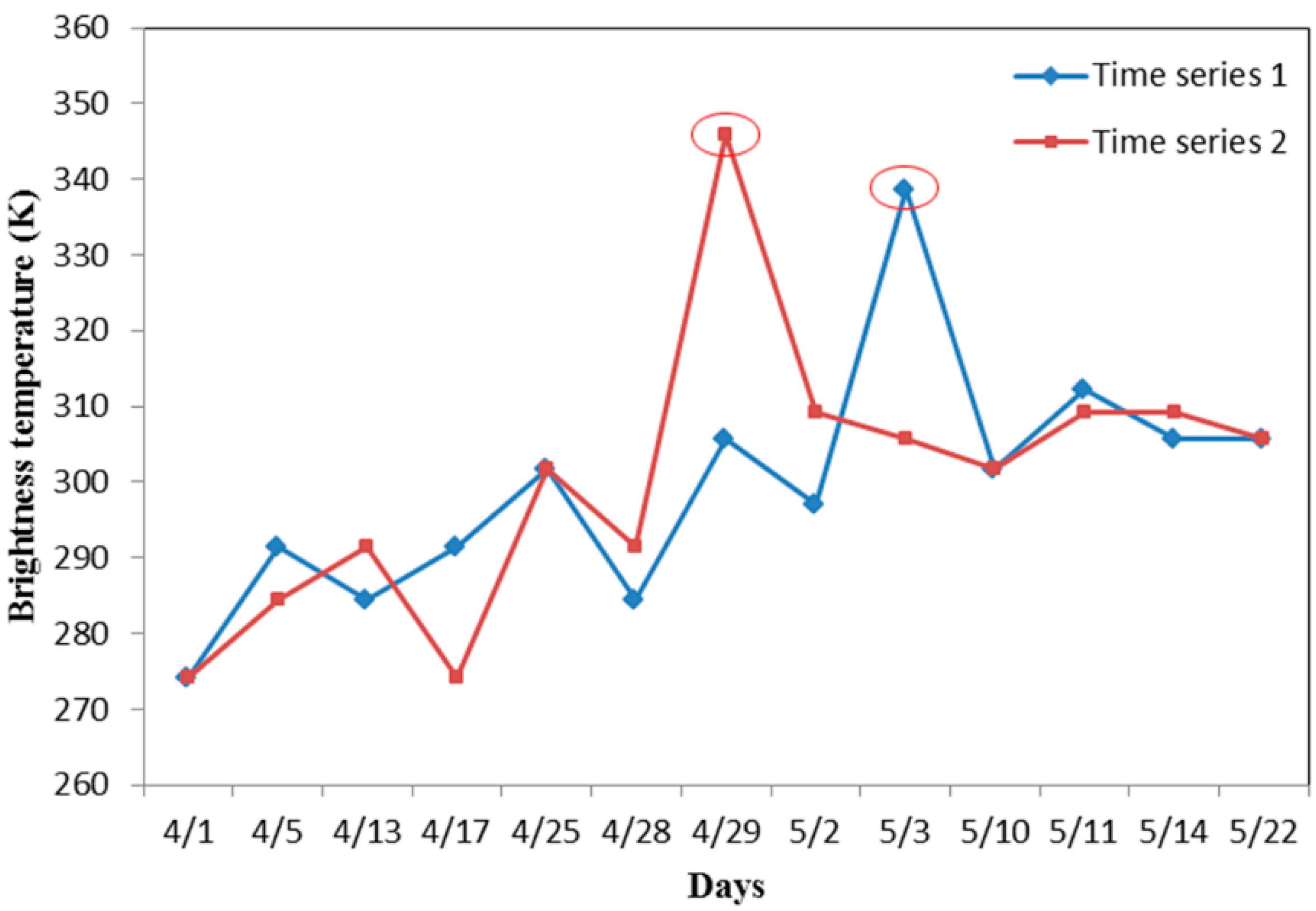For single-date fire detection methods, a temperature anomaly is the variation between a particular temperature and the average temperature for its neighboring pixels (Equation (1)) because the fire produces a local increase in temperature above that of the neighboring pixels. However, it is hard to obtain enough valid neighboring pixels when there is a large fire, and the window size must be large enough for high-resolution images. For multi-temporal images, a pixel that has a BT significantly higher than the values in previous moments will also be regarded as a fire pixel (Figure 10). Therefore, to compare the inspected pixel’s BT with its previous BTs, we added additional temporal information to STM by assigning different weights to multi-temporal images (Equation (12)). In addition, the mean absolute deviation varied tempestuously in different images, which resulted in instability in the forest fire detection results. To obtain a more robust result, we also added different weights to the calculation of the mean absolute deviation (Equation (13)). In summary, the approach was based on a change detection scheme that detects signal anomalies by utilizing the spatio-temporal domain of the HJ-IRS data.