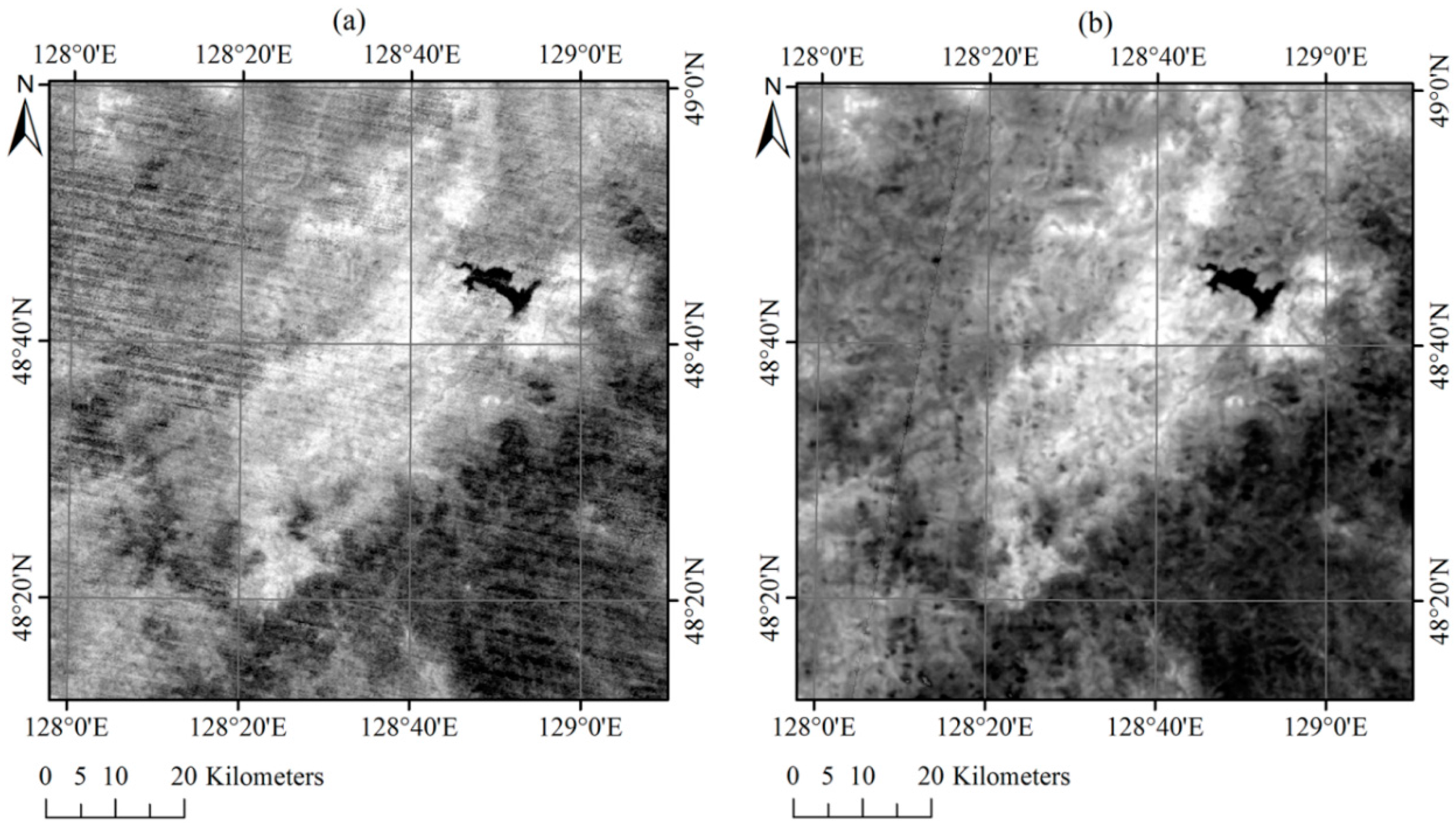 The preprocessing procedure for the IRS images includes the following processes. (I) Resampling: Because the pixel resolution of the band 8 IRS images is 300 m, whereas the resolutions of the three other (band 5, band 6, band 7) are 150 m, we converted band 8 to 150 m by nearest-neighbor resampling, which assigns the digital number of the closest input pixel to the corresponding output pixel; (II) Geometric calibration: The image acquired on 1 April was chosen as the reference image, and the other images were corrected using geometric calibration with a correction error of 0.5 pixels or less; (III) Cutting out the region-of-interest (ROI): A 90 × 90 km2 square region (600 × 600 pixels for HJ-IRS) was chosen as the validation site. A ROI between 48°11′49.0″N and 49°0′45.0″N latitude and 127°57′41.8″E to 129°10′39.4″E longitude covered the entire fire zone in the Yinanhe forest; (IV) Reflectance calculation and brightness temperature inversion: This process was used to convert the digital number (DN) values to radiances, reflectance and BTs. According to the absolute radiometric calibration tests conducted by the China Centre for Resources Satellite Data and Application, the DN values for bands 5 were converted to radiance values using Equation (3), whereas the DN values for bands 7 and 8 were converted to radiance values using Equation (4). The radiances for band 5 were converted to reflectance using Equation (5). The radiances for bands 7 and 8 were converted to BTs using Equation (6), which was derived using Planck’s law.
