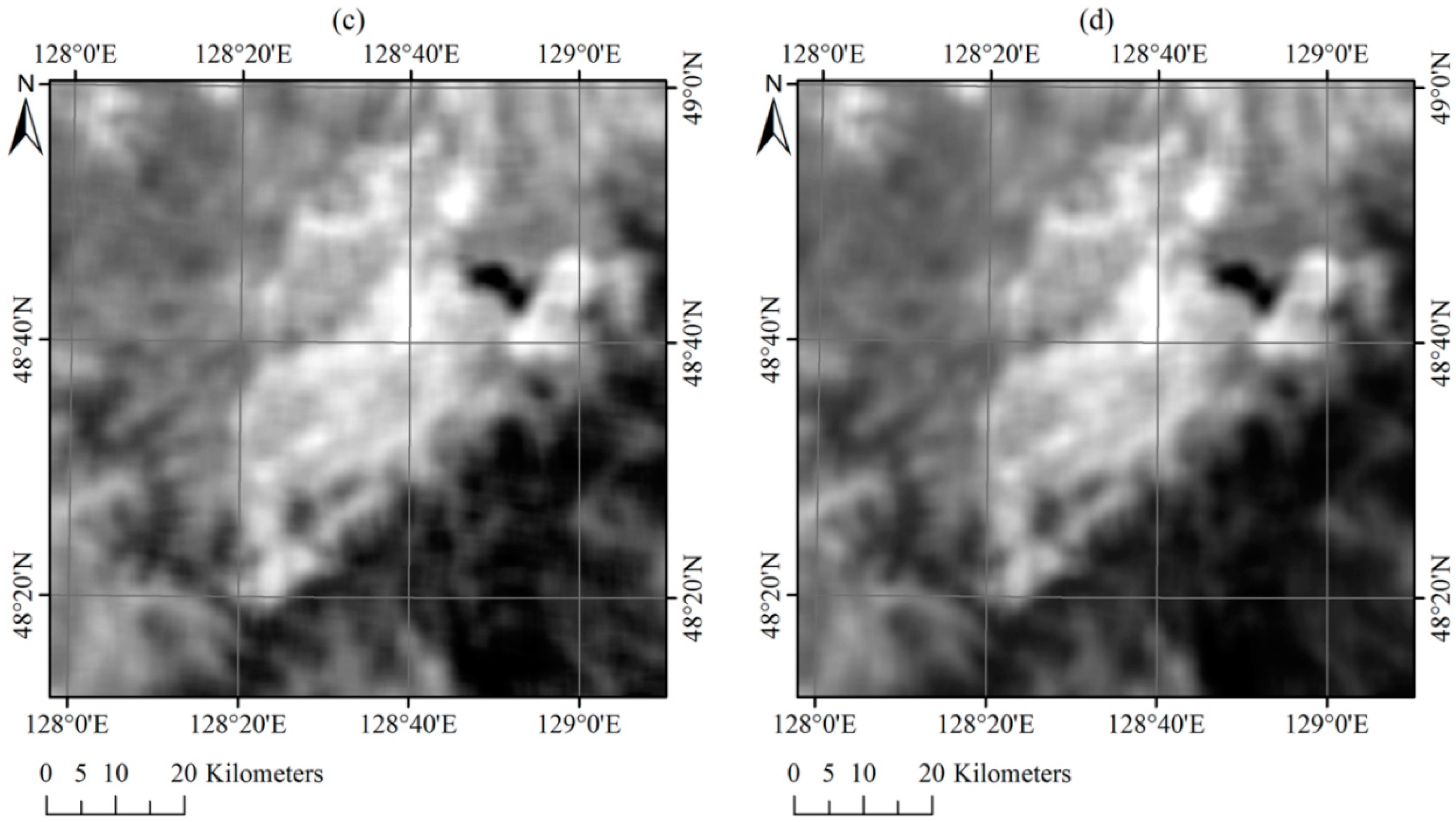 BT images of band 7 (a) and band 8 (b) predicted using the spatio-temporal model (STM); and BT images of band 7 (c) and band 8 (d) predicted by averaging the neighboring pixels.