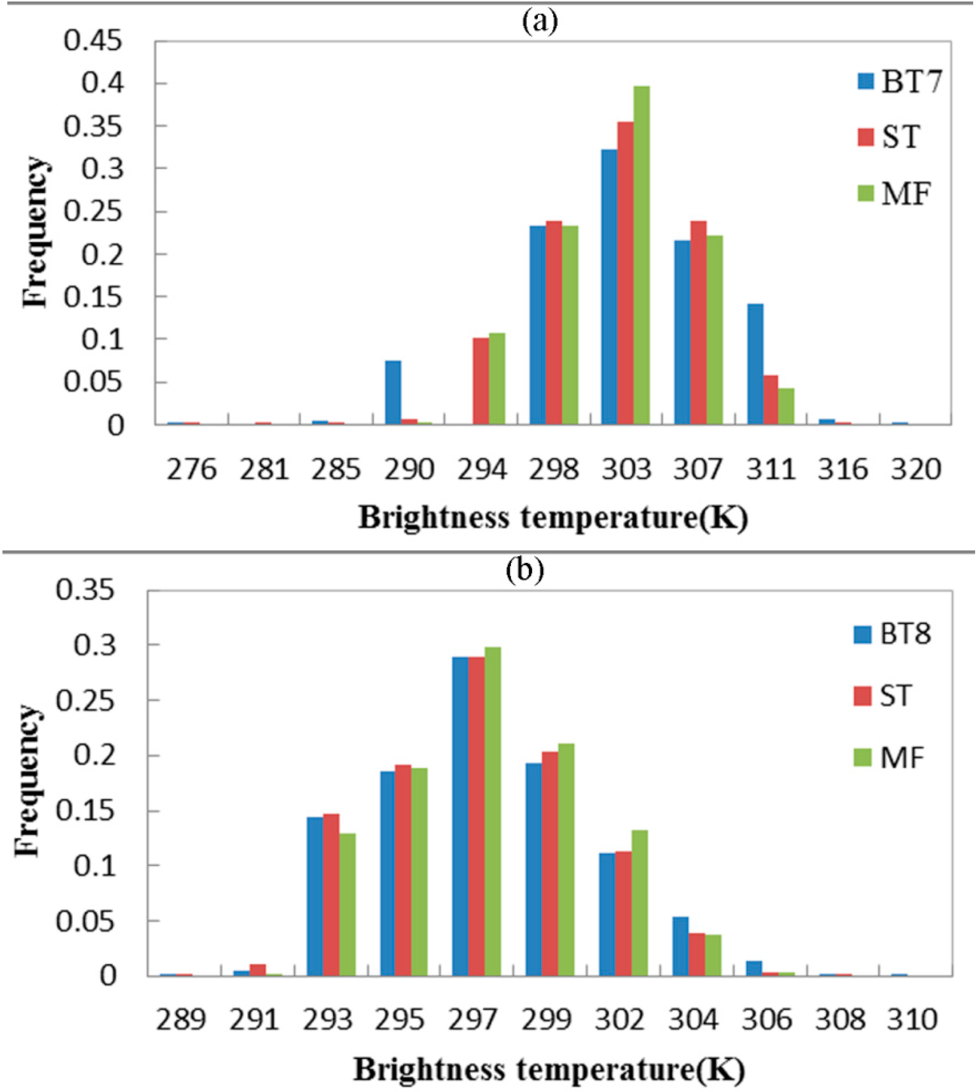 Frequency histograms of the background BT predictions and the actual BTs measurements from band 7 (a) and band 8 (b). “BT” denotes the actual background BT measurements, “ST” denotes the background BTs predicted using STM, and “MF” denotes the background BTs predicted by averaging the neighboring pixels.