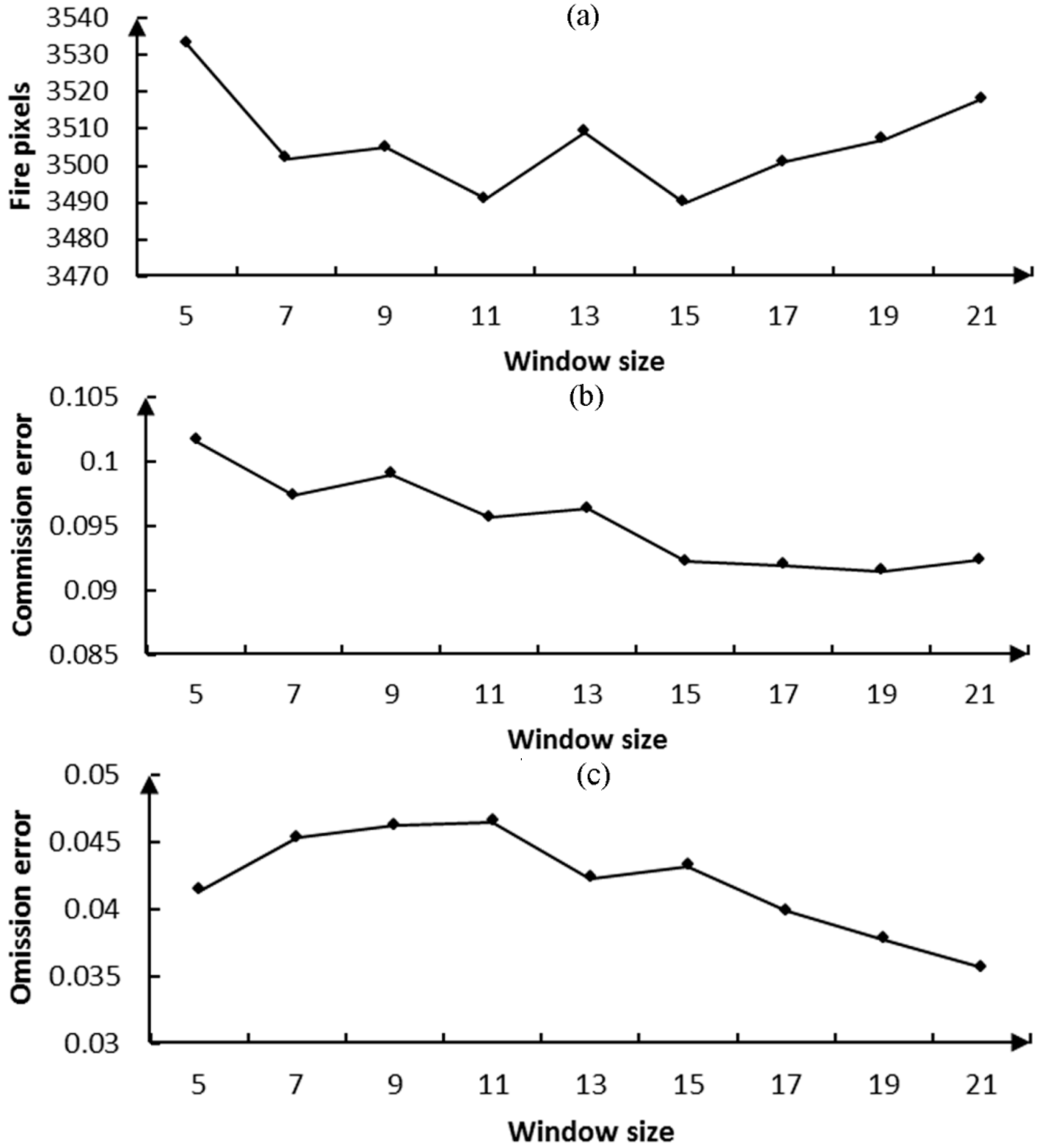 Fire detection results of the image acquired on 29 April with different STM window sizes: (a) number of fire pixels; (b) commission error; and (c) omission error.