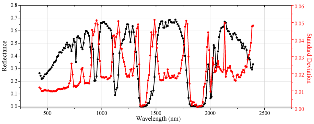 Figure 7a shows the spectral reflectance derived for the Algodones Dunes sand surface on 9 March 2015. In addition, the coefficient of variation (CV) defined as the ratio between the standard deviation and the average is shown as a percentage in