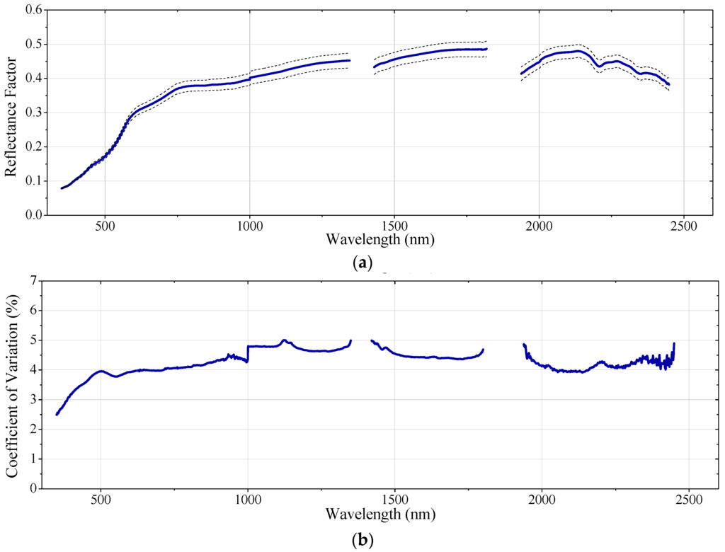 43] suggest that a certain surface is sufficiently spatially uniform if the Coefficient of Variation (CV) is lower than 5%. The average relative CV of the spectral measurements ranged from 2.5% to 5.0%, indicating that the reference surface at Algodones Dunes presents a spatial uniformity better than 5%.