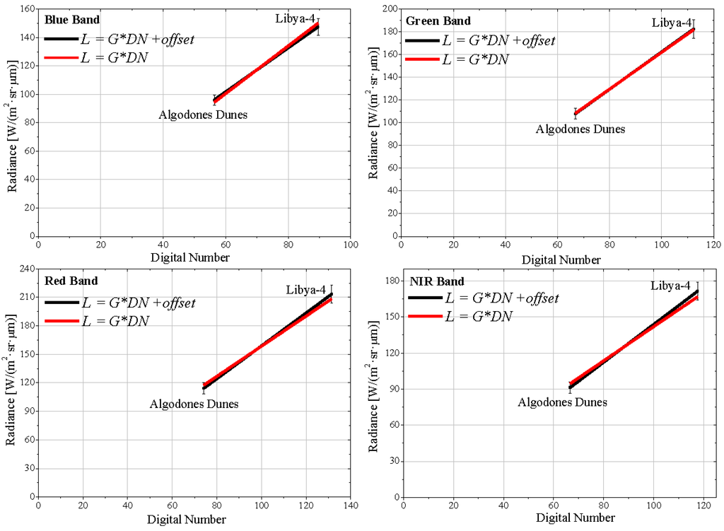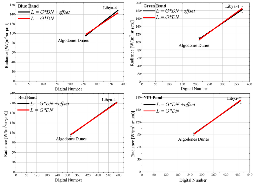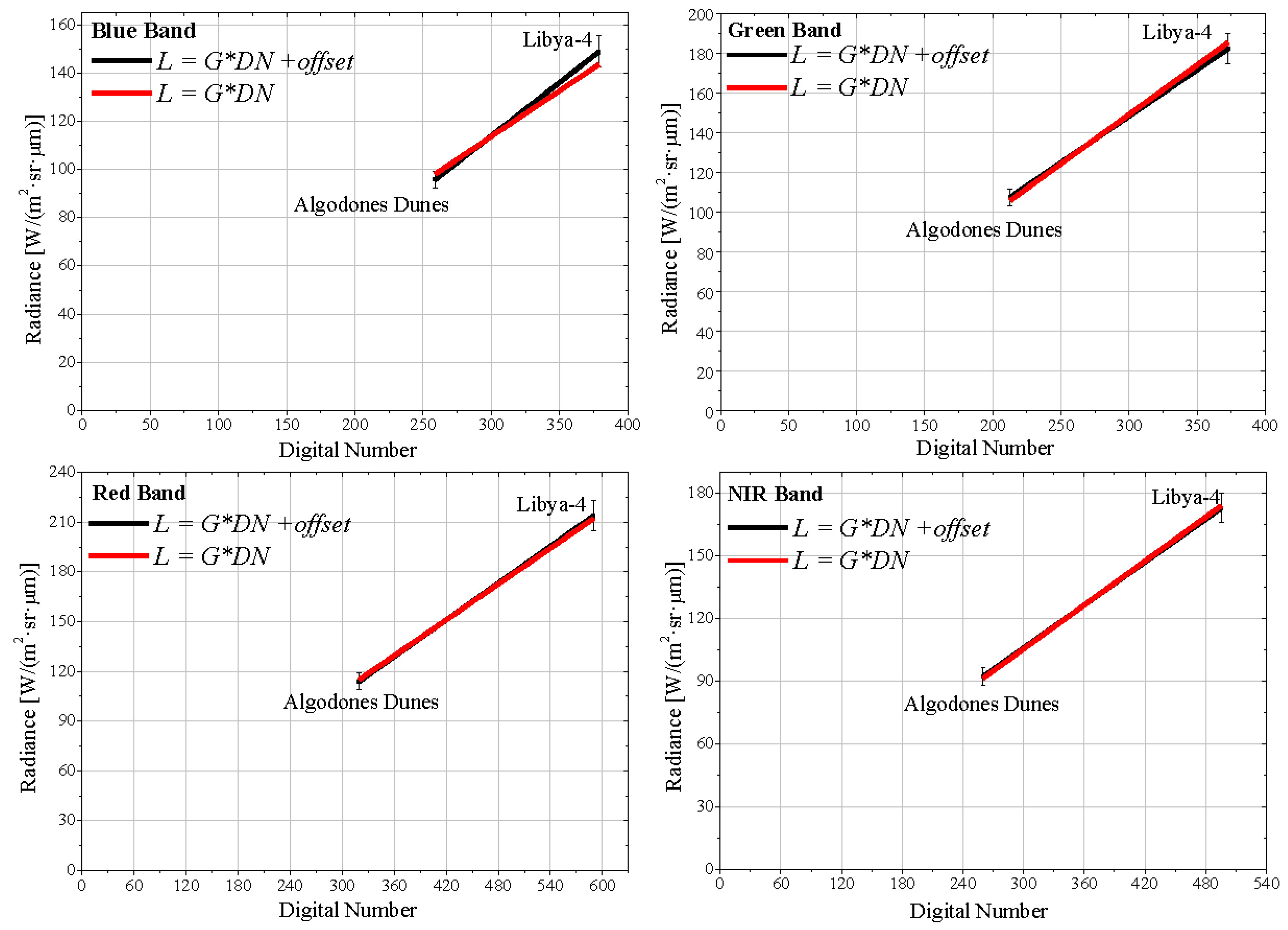 Table 6) and through cross-calibration another point was generated. The cross-calibration results between CBERS-4 and Landsat-8 using images acquired from Libya-4 can be seen in