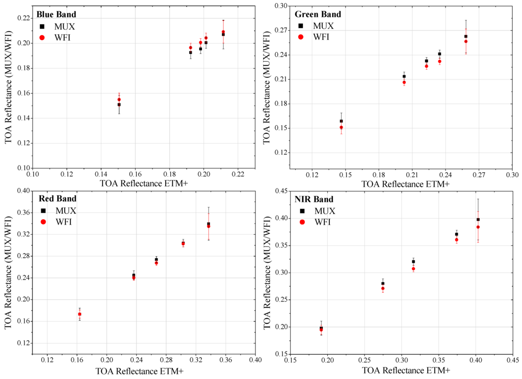 Figure 11 that the relationship between Landsat-7 (ETM+) TOA reflectance and CBERS-4 (MUX and WFI) TOA reflectance is linear, supporting the idea that the detector response is linear. Furthermore, the reflectance values of the three sensors (ETM+, MUX and WFI) are compatible within the associated uncertainty with each of them.