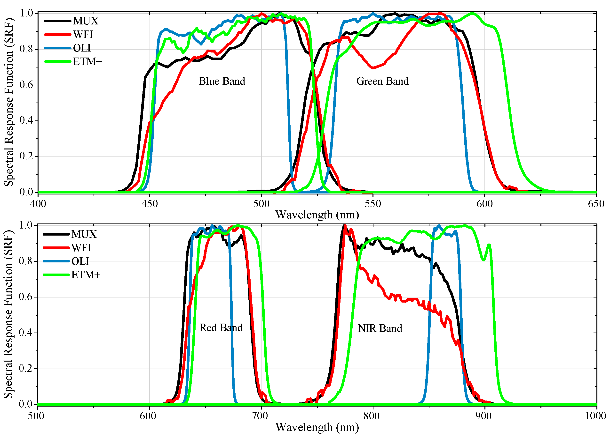 Figure 1 also presents the Landsat-8/OLI and Landsat-7/ETM + SRF.