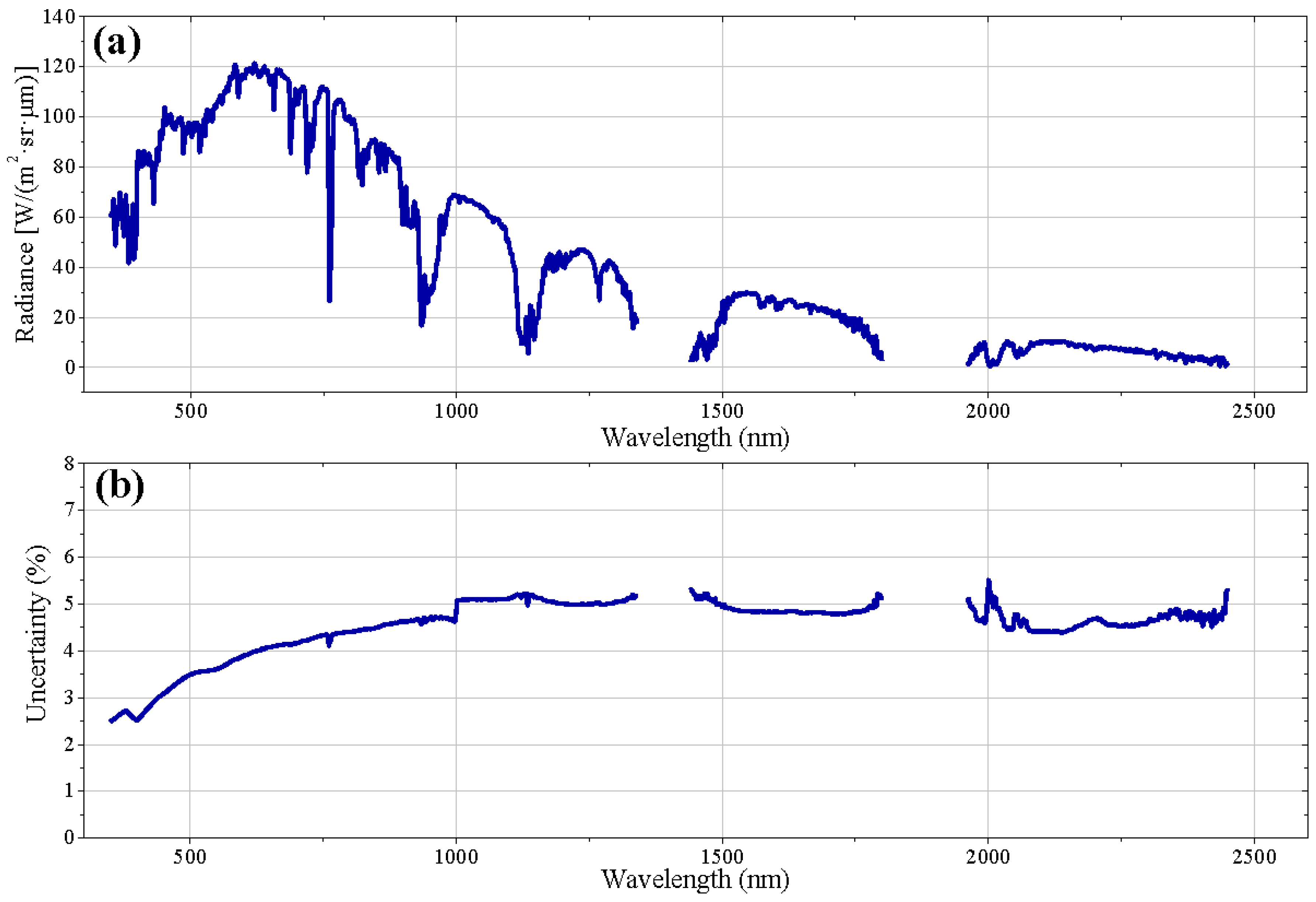 Past work with the reflectance-based method as used here indicated that the method presented absolute uncertainties of ±5%, and estimated that improvements should result in an uncertainty of ±3% in the middle of the visible portion of the spectrum [