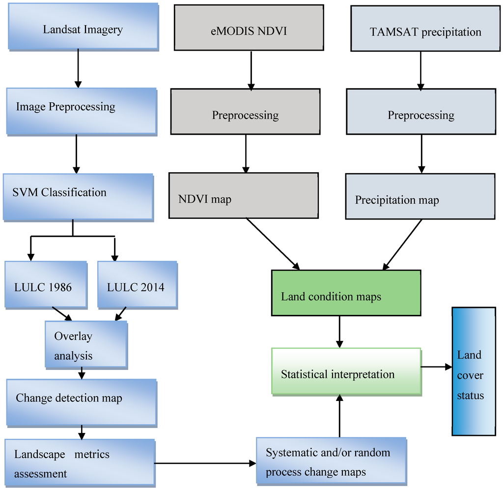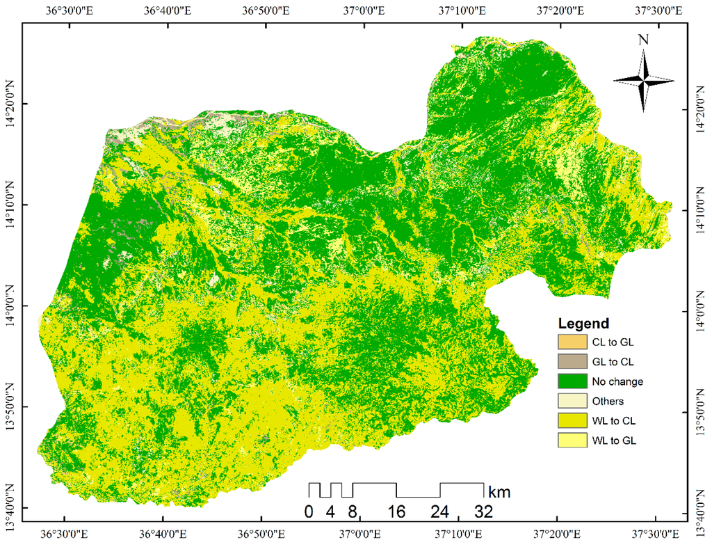 Land use/land cover (LULC) change assessment of drylands is gaining more consideration by global environmental change studies as land use modification is exposing them to transitions and high rates of resource depletion [11]. LULC studies focused on understanding the patterns, processes and dynamics of land transitions and its drivers over time [12,13,14,15,16]. The processes of these land use transitions can be categorized into either random or systematic changes based on identifying their pattern of categorical changes [12,17]. A random process of change occurs when a LULC category loses to or gains from other categories in proportion to the size of other land cover categories, while systematic transitions are driven by the regular processes of transition that change in a constant or gradual development [12,14]. Post-classification comparison (PCC) is among the change detection approaches that can be used in order to determine changes between satellite imagery of different sources and dates [18,19].