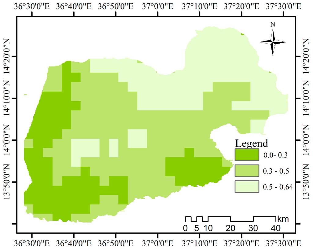 Spatial regression of NDVI and precipitation over Kaftahumera for the period 2000–2014; the values indicate pixel-wise R2 of NDVI vs. precipitation.