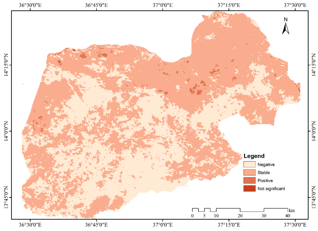 The spatiotemporal linear regression analysis of the slope of the annual sum of NDVI is illustrated in Figure 6. The slope is a measure of the direction and strength of annual NDVI variation from 2000–2014, in which a negative slope depicts a reduction in vegetation productivity over the study period. The assessment shows a significant reduction in the productivity of vegetation in most parts of the study area. The temporal reduction in NDVI resulted from the change in the spatial distribution of the woody vegetation and other human-induced changes in the ecosystem. The woodlands of Kaftahumera are affected by human activities, mainly due to cropland expansion, wood harvesting and resettlement, and show a significant reduction in vegetation productivity with negative trends in areas where settlement and cropland were expanding.