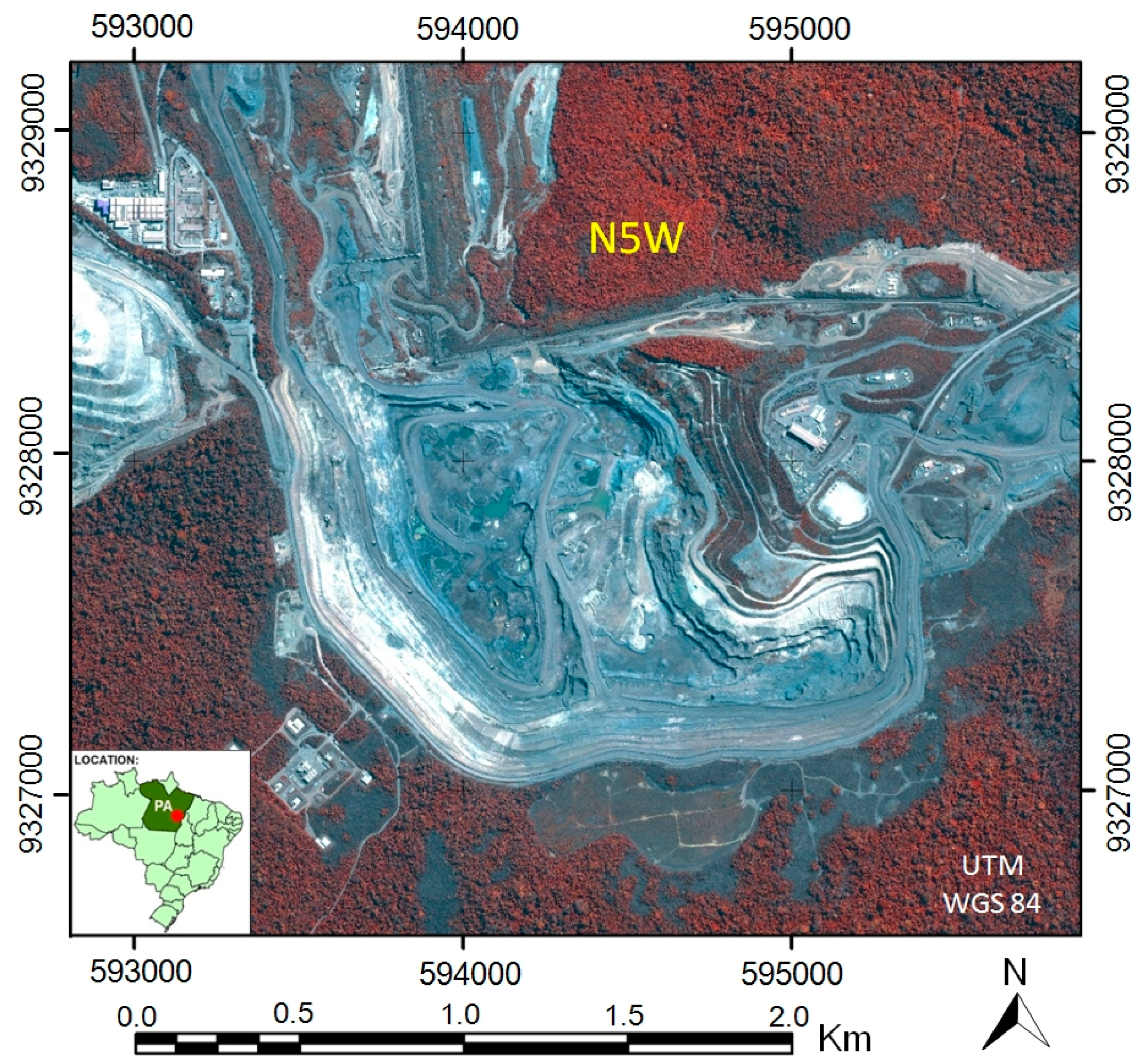 The iron deposits are covered by thick, hard iron crusts (lateritic duricrusts) developed over volcanic rocks and ironstones. Specific low-density savanna-type vegetation (campus rupestres) is associated with the deposits, and shows a strong contrast (clearing) with the dense equatorial forest. Fully owned by Vale S.A. mining company, exploration in Carajás is carried out through state-of-the-art open pit benching. The current mining activities are related to two iron ore bodies (N4 and N5) and started with the N4E mine in 1984 and with the N5W mine (Figure 1) in 1998. Carajás Mining Complex produces approximately 300,000 metric tons of iron ore per day [26]. The analyzed mine N5W has an area of 4.41 Km2 with a pit depth of 190 meters and maximum slope angle of 31°.