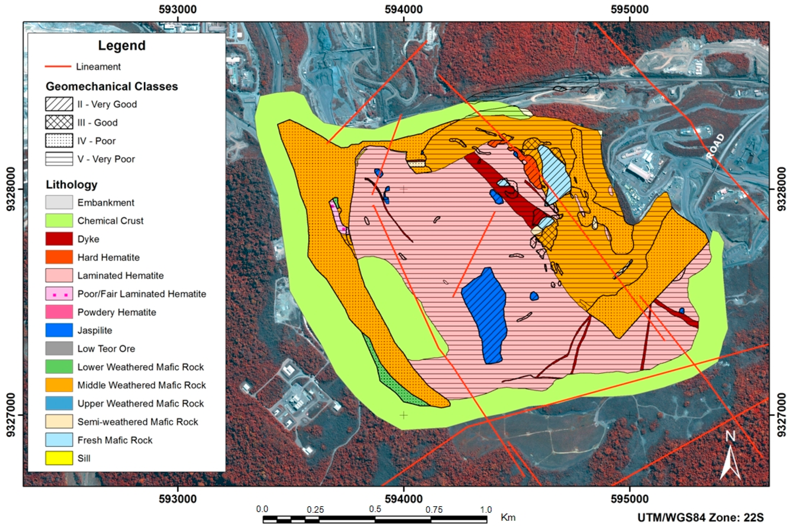 The most detailed available account of the geological and geomechanical information for the N5W open-cast pit is given by BVP [27], with surface outcrop mapping carried out at a 1:2000 scale, followed by rock classification based on mining nomenclature, characterization of structural and geomechanical parameters, with strength tests for rock units and back analysis of slope failures. Based on this report, the mine is composed by rock masses defining heterogeneous and anisotropic products with different responses to shear strength. The lithological and geomechanical classes are presented in Figure 2, as well as the interpreted lineaments extracted from photointerpretation. Mafics are country rocks of the iron ore, which are normally covered by lateritic duricrusts. Based on geotechnical parameters, the mining nomenclatures for mafics are: unweathered (fresh) mafic, weathered mafic with inferior resistance, weathered mafic with medium resistance, and semi-weathered mafic. The ironstones are classified based on physical-chemical parameters in jaspelite, soft hematite (laminated and powdery hematite), and hard hematite. Depending on the intensity of the foliations, soft hematite can be classified as strongly laminated and weak/moderate laminated. Hard hematites crop out as small lenses and small body, and sills are emplaced into these units that are covered by layered iron duricrusts, chemical crusts and lateritic soils. The main structures from detailed mapping are related to a strike-slip fault system oriented to NW-SE, (dipping to NE) and a joint system with sub-vertical trend oriented to EW. In addition, structural information extracted from photointerpretation using a stereo pair (RADARSAT-2 Ultra-Fine x TSX-1 StripMap scenes) were also integrated into the final geological map. Finally, the results of strength tests and back analysis of slope failures indicated that the main lithotypes in the N5W mine, exhibited an overall poor strength ranking classification according to the RMR (Rock Mass Rating) parameters [28].
