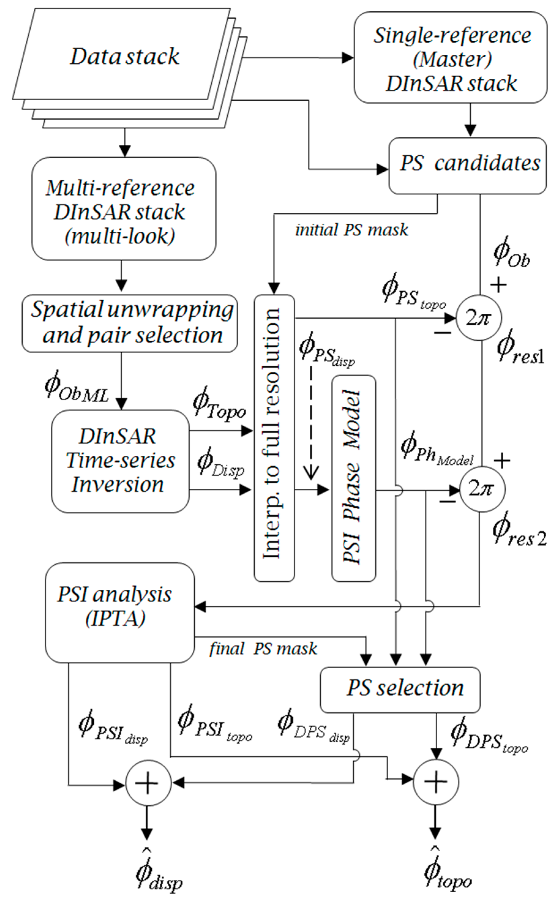 The PSI processing sequence includes SAR SLC image co-registration to generate the stack of differential interferograms. The master scene is selected based on a configuration that provides low perpendicular baseline dispersion positioned close to the center of the time-series, in order to maximize the interferometric coherence. The PS candidates are estimated based on the amplitude dispersion index [11] and low spectral diversity [12] at each pixel of the stack of the co-registered images. Considering a reference point located in a stable area and a selected generic PS in the coordinates (x,r), the observed wrapped phase values of this point in relation to the reference point can be organized in a vector of N elements, as