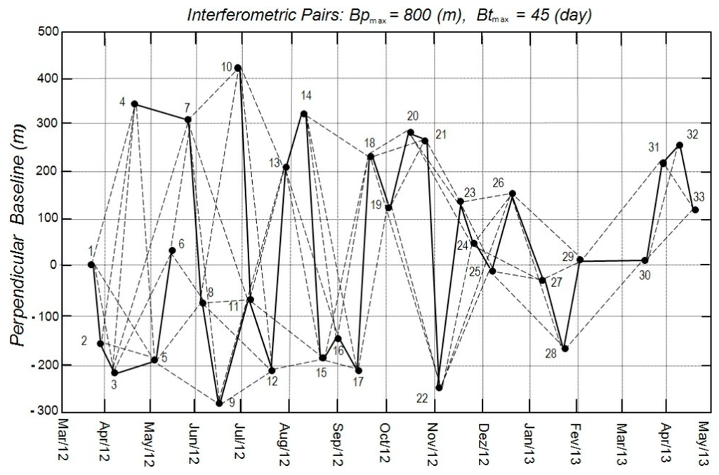 The selection of the differential interferometric pairs to perform the DTS was based on the criterion of the highest coherence in order to reduce phase-unwrapping errors covering the time span of the investigation. Visual inspection was also used to discard interferograms with compromising phase-unwrapping errors. Figure 4 shows the selected set of interferometric pairs (solid lines) and the discarded pairs (dashed lines). Most of the selected pairs belong to the shortest time interval among acquisitions (11 days).