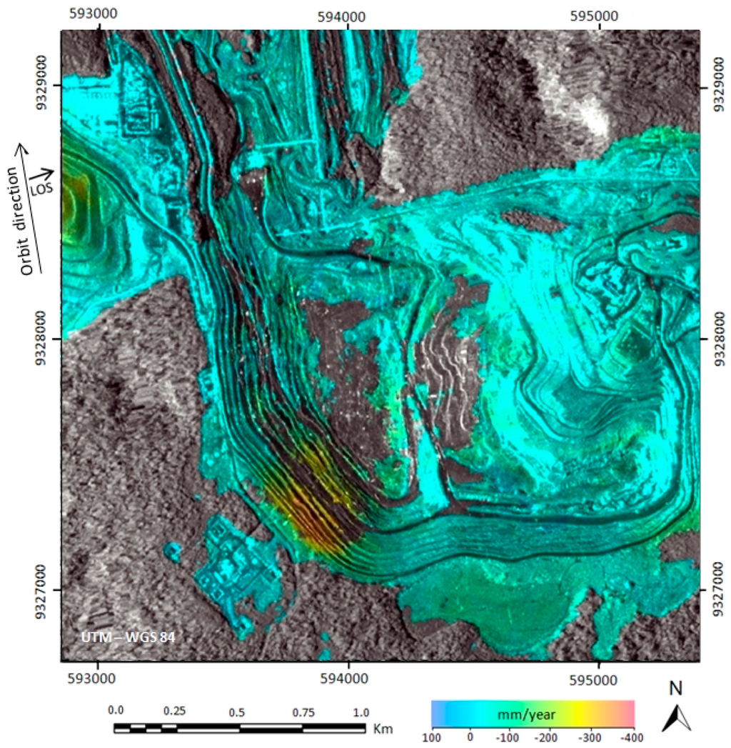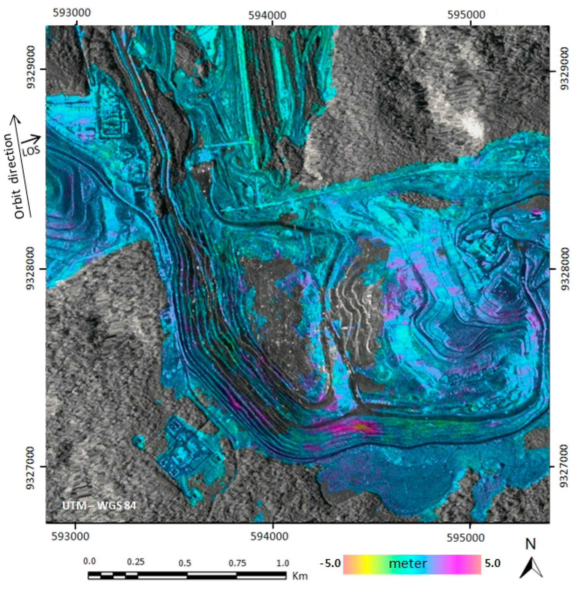 Instabilities can be expected from any mining activity. Open pit operations usually have significant extensive areas and can also influence large portions of terrain adjacent to the pit crest. Rock mass movements and surface deformations potentially lead to slope instabilities or wall failures due to regular open pit mining operations. Advanced DInSAR techniques have been used to measure ground movement in underground mines [16,17,18,19,20], as well as in open pit mines [21,22,23,24], providing spatial coverage and reliable measurements of ground movement.
