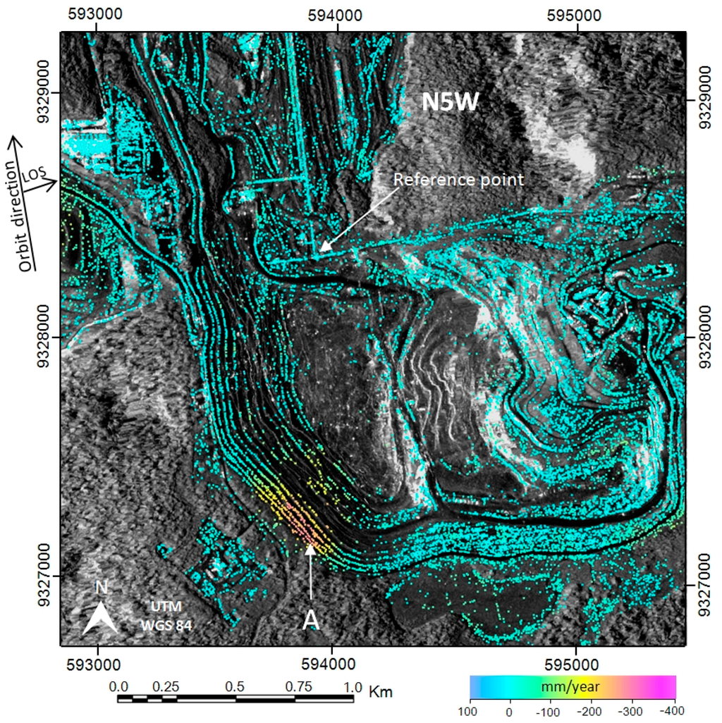 The results of the PSI processing, using previous information about phase displacement model and DEM error derived from the DTS, were able to detect areas with high non-linear ground deformation rates, as shown in Figure 7 and Figure 8. The density of the PS in the final processing was 16,365/Km2, considering only the masked area (4.41 Km2) of the N5W mine (excluding the forested area around the mine), which can be considered of high density. High deformation was detected along pit benches and ramps on the SW sector of the N5W mine, with deformation rate up to −340 mm/year, as shown in point A (Figure 7 and Figure 8), which is associated with surface movement evidences (fractures on bench walls, tension cracks on berms and road ramps). The contribution for the ground deformation can be associated to the deep excavation on low-quality geomechanical ore/rock masses, and a structural control given by NW-SE trending shear zone and EW trending fault system, as mapped by BVP under Vale´s contract [27].