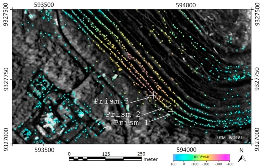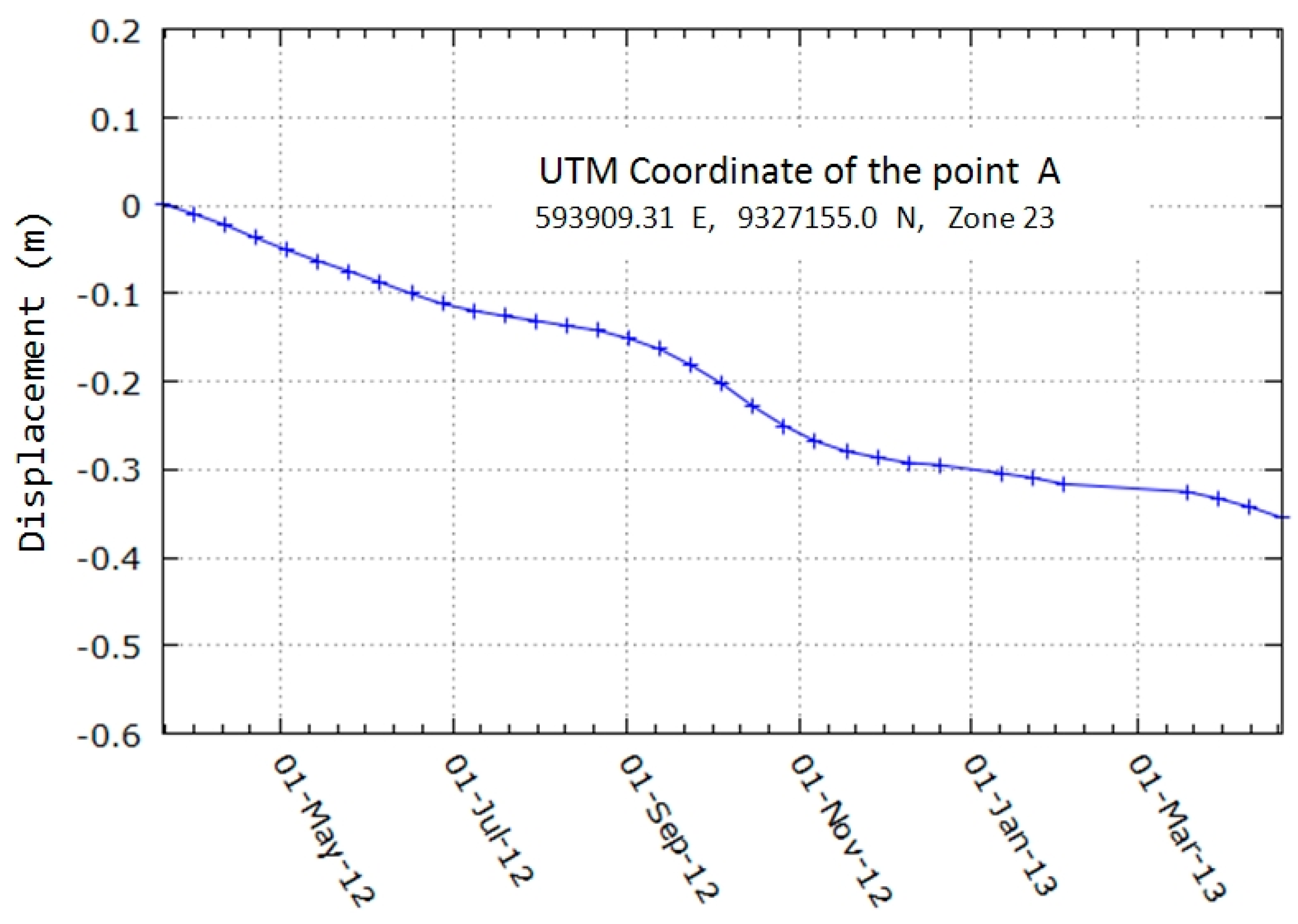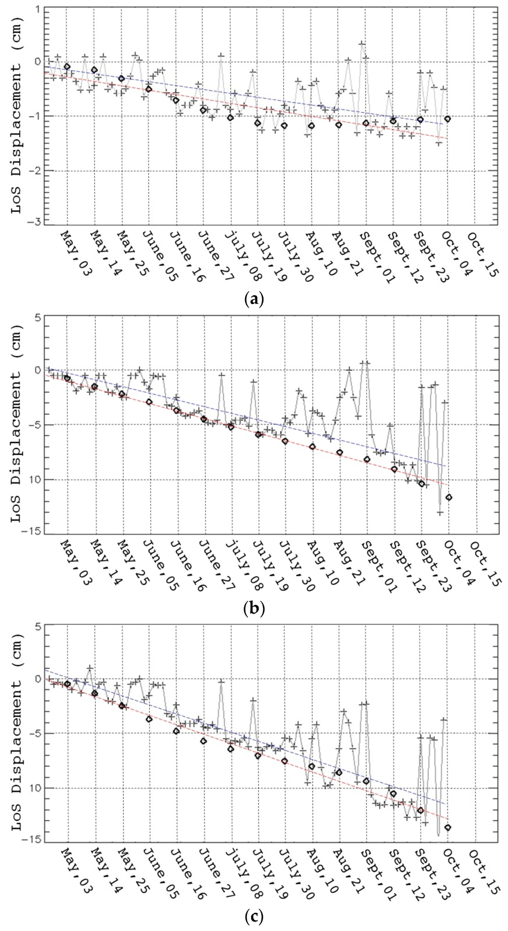 Figure 11 shows the topographic measurements of the prisms using total station (from 24 April 2012 up to 28 September 2012) projected in LoS direction (connected cross-points) and the PS displacements (near the prisms) represented by diamonds (from 3 May 2012 up to 4 October 2012).