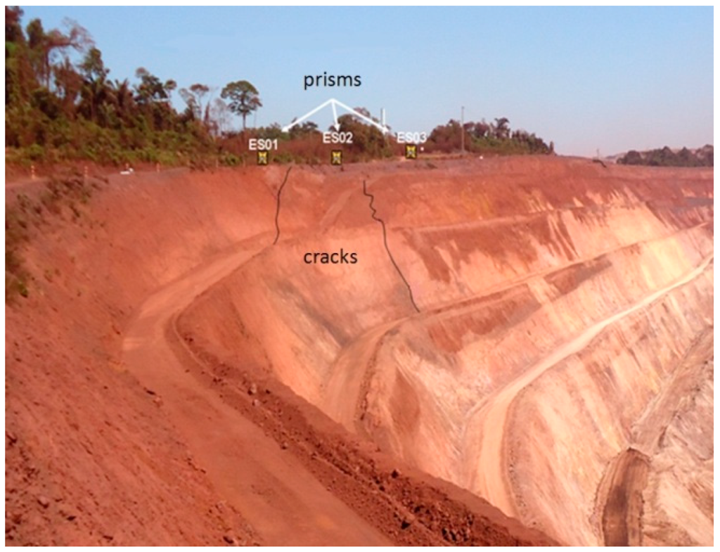 Signals of surface instabilities given by the presence of fractures and cracks on bench walls, berms and a road ramp have been detected by Vale´s geotechnical team since the beginning of March 2012 in the SW sector of the mine. In this area, which is situated over lateritic crusts and saprolitic soils, excavations in rock alteration products of low geomechanical quality leading to the loss of slope base support caused by routine operations within the pit face, coupled with blasting practices with successive detonations causing overbreaks to the inferior benches, have contributed to the reactivation of fractures/cracks on the cut slopes. The area was systematically monitored using total station/prisms, extensometers, and for a short period by GBR. Field measurement records have shown that the onset of instabilities remained without significant evolution up to 12 August 2012, when a reactivation with relevant displacement on bench faces was detected, reaching a total variation of 10 cm (vertical) in the middle of September 2012 (a prism measurement). Measurements with GBR for bench walls covering the period of middle to the end of October 2012 revealed an average deformation of 14 mm, reaching a maximum value of 16.9 mm (in the LoS of GBR). The geotechnical evaluation carried out by Vale S.A. in this mine sector is conclusive regarding the absence of major instabilities that could lead to large-scale movement and eventual failure [29].
