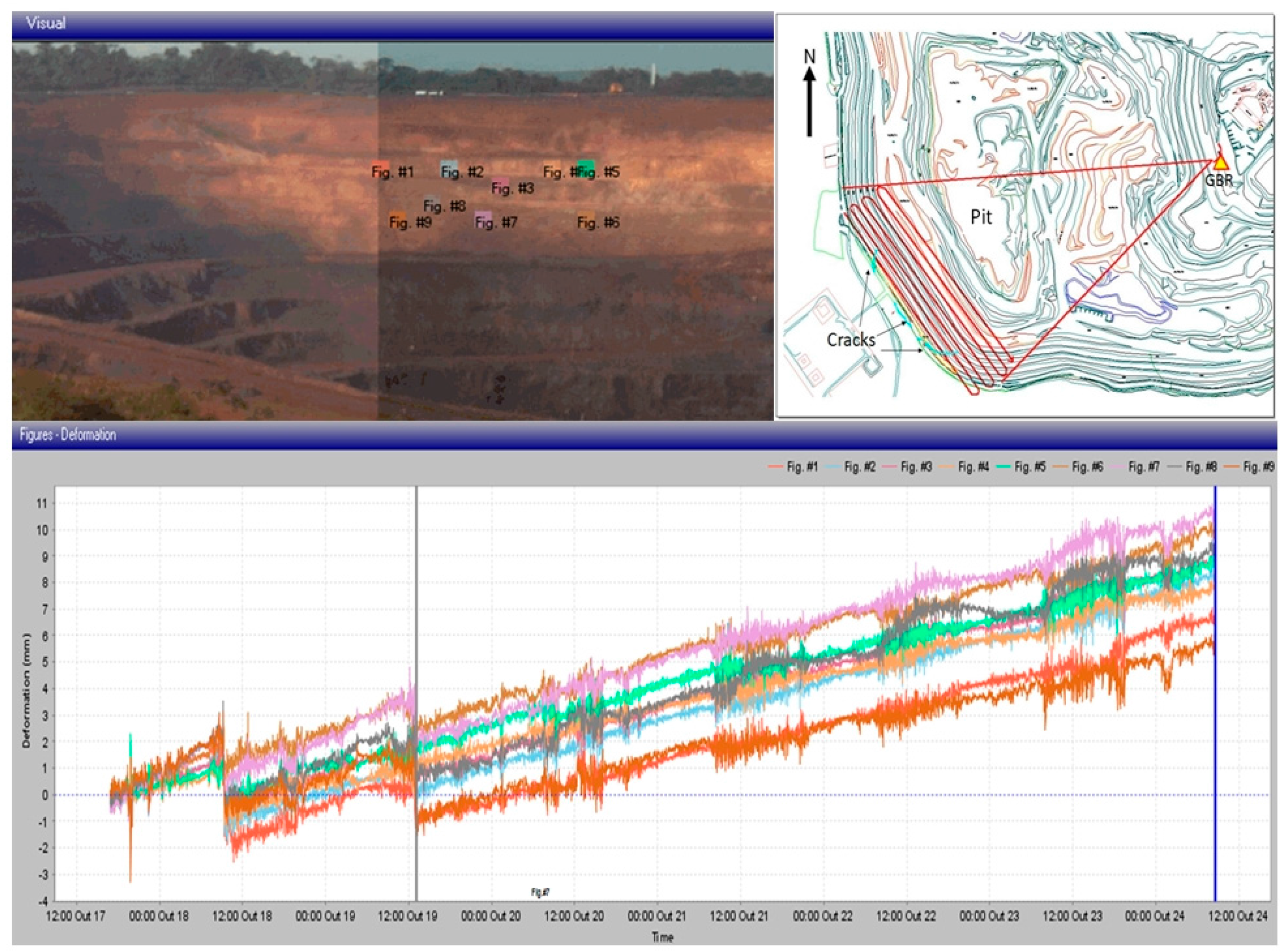Monitoring using GBR in nine points on the pit wall of the N5W mine (upper part of the figure, on the left, shows the locations of the points and on the right the positioning of the ground radar). The lower part of the figure shows the graphics of the displacement in LOS-projected GBR geometry.