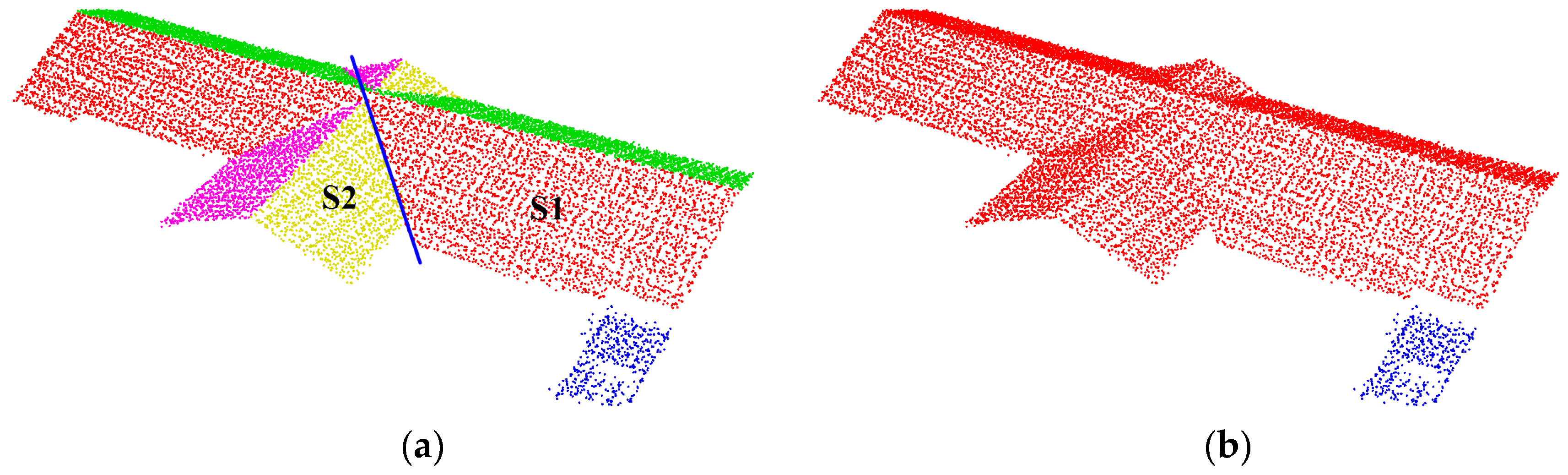 The red box in Figure 1a contains a number of protuberant points (i.e., a small number of points above a large rooftop patch); however, these protuberant points were not seen in the rooftop patch segmentation results (Figure 1b). If these protuberant points are directly discarded before building roof reconstruction, some holes will appear on the building roofs. As these points are usually distributed above the real rooftop patches, we set a distance threshold (2 m) to recognize them. After all the protuberant points have been found, they are projected to the corresponding segmented rooftop patch by using the plane equation calculated by the RANSAC algorithm [29].