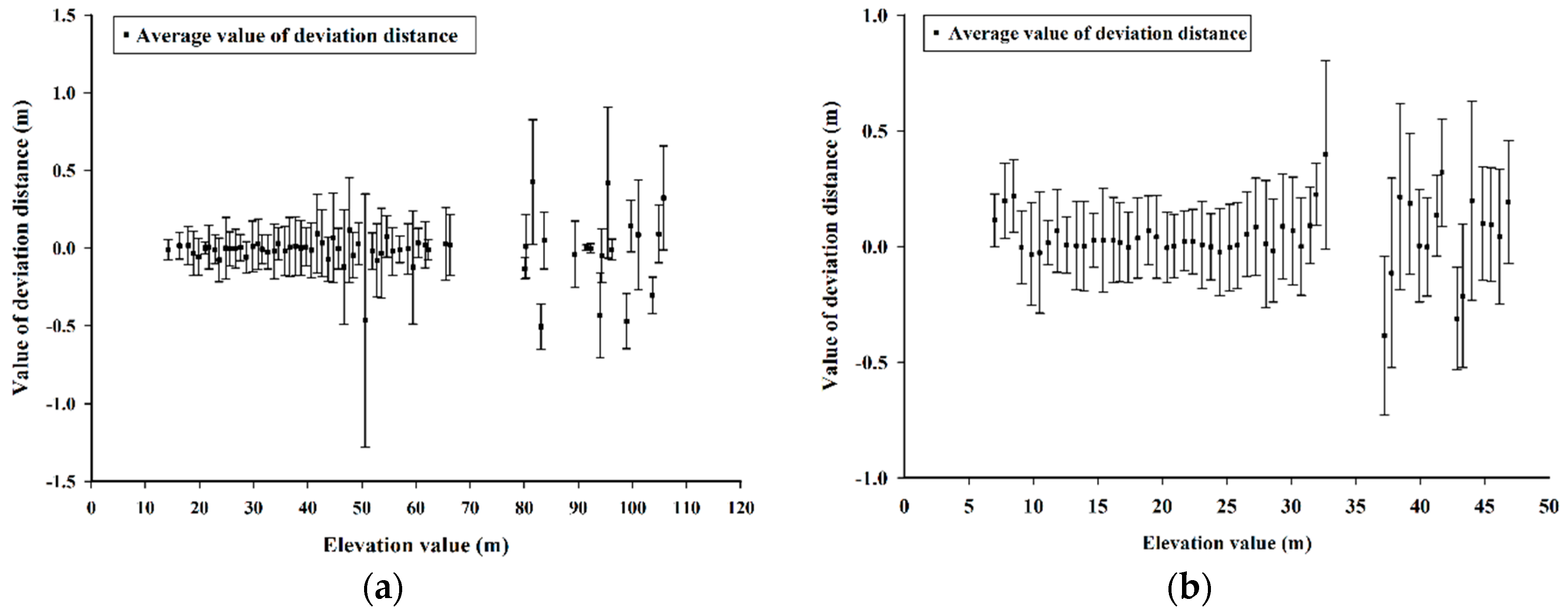 This study also analyzed the influence of elevation on the reconstructed building roofs. First, the airborne LiDAR points of buildings were divided into different groups according to the elevation value (the elevation interval was set to 1 m). Afterward, we calculated the deviation distance under each elevation range. The statistical results of Regions 1 and 2 are shown in Figure 11a,b, where the solid squares in the figures represent the average values of the deviation distances under each elevation range and the error bars represent the positive and negative deviations of each average value. From Figure 11a,b, we can draw some conclusions. First, most of the average values of the deviation distances were located in the range from −0.05 m to 0.05 m. Second, in regards to different ranges of elevations, when the elevation was more than the height of a specific value (80 m in Region 1; 37 m in Region 2), fluctuations of the average values and standard deviations were larger than those where the elevation was less than a specific value (70 m in Region 1; 33 m in Region 2). The reason for this phenomenon is that for modern high-rise buildings, there are many central air conditioning units on the building roofs, but there are not reflected in the reconstructed building roofs. Therefore, the average values and standard deviations are more sensitive to the presence of modern high-rise buildings.