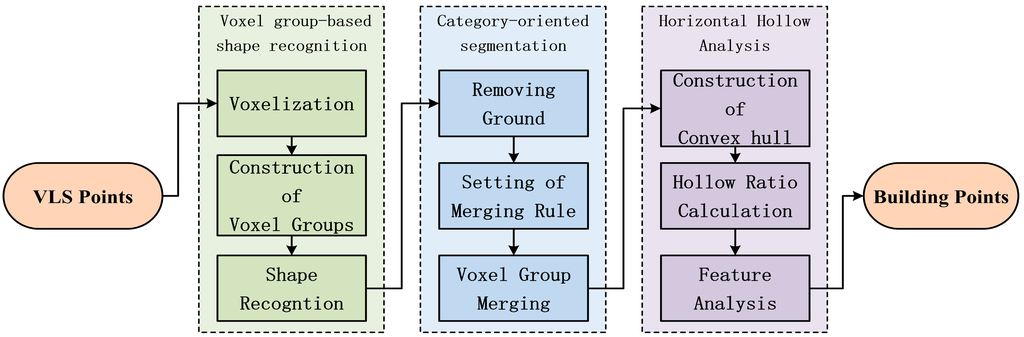 To address these problems, this paper proposes an approach on automatically extracting various types of buildings, from vehicle-borne laser scanning data acquired from the large-scale complex environments of urban regions (see Figure 1). First, a new structure, called “voxel group”, is applied to further organize voxels based on the voxelization of VLS points. The method will process each voxel group instead of discrete point clouds to accelerate the calculation. Then a simple way is applied to quickly recognize the shape of point clouds in each voxel group. Second, a category-oriented merging is used for merging voxel group by utilizing the shape information to obtain high precision point clouds clusters. At last, a novel characteristic nature of vehicle-borne LiDAR building points, called “horizontal hollow ratio” for efficient extraction of various forms of buildings.