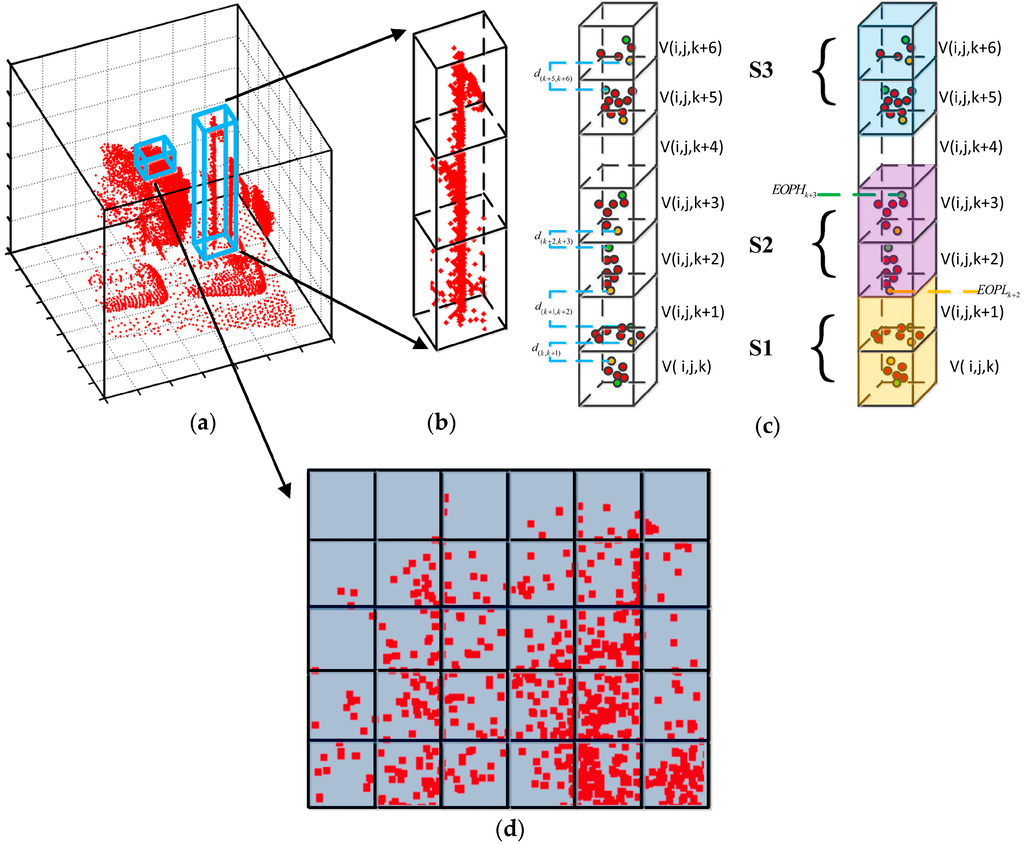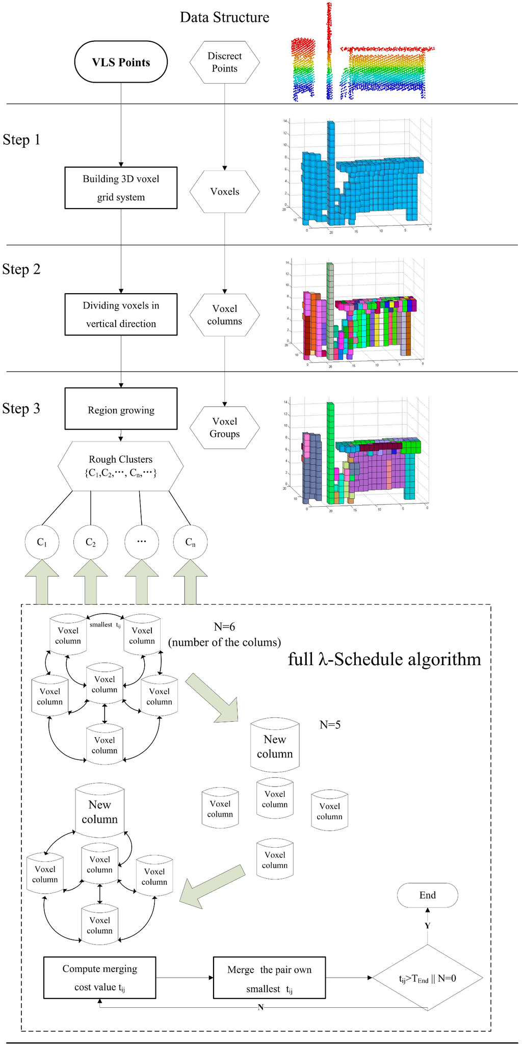 The proposed method take a connectivity-based region growth as first in Step 3 is because the computational complexity of the full λ-Schedule algorithm is o(mglog2(mn))for a 2D image of m × n pixels [56]. For 3D voxel grid system, the computational complexity will be higher so the origin 3D voxel grid system must be divided into pieces to reduce the amount of involved voxel columns in one process. Finally, all voxel columns are combined into a higher-level structure, the voxel group. The LiDAR points within each voxel group belong to the same single real-world object and have the same geometric properties or shape information.
