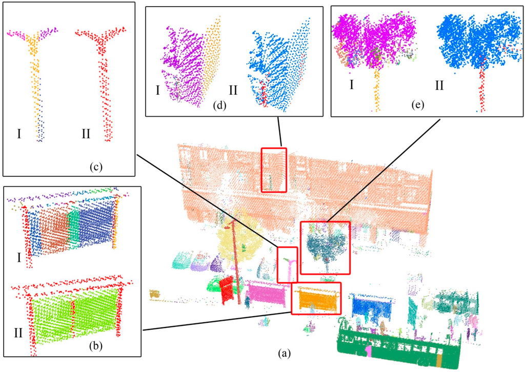 Category-oriented merging. (a) Merging results, points of the same color belong to the same segment; (b–e) I: Single real-world object with several voxel groups, points of the same color belong to the same voxel group; II: Shapes of one object, red denotes linear points, green denotes surface points, and blue denotes spherical points.