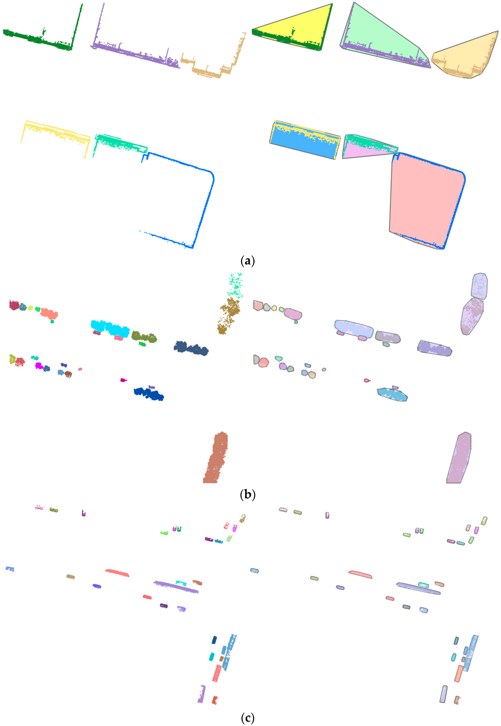 (1) The proposed approach, including voxel group-based shape recognition, category-oriented merging, and horizontal hollow-based building point identification, can be applied in the various types of buildings, in large-scale and complex urban environments.