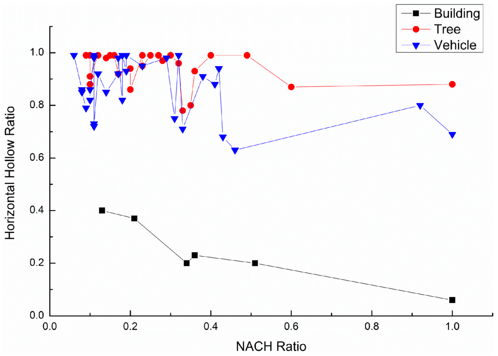X-axis (NACH Ratio) represents the normalization ratio between the area of each object’s convex hull and the maximum convex hull area common to this type of object. This ratio indicates the morphological changes of objects. The Y-axis represents the horizontal hollow ratio. The horizontal hollow ratio of tree is very close to the horizontal hollow ratio of car while building’s horizontal hollow ratio is significantly smaller than that of the other two kinds. A detailed procedure for building points extraction based on horizontal hollow ratio can be described as follows.