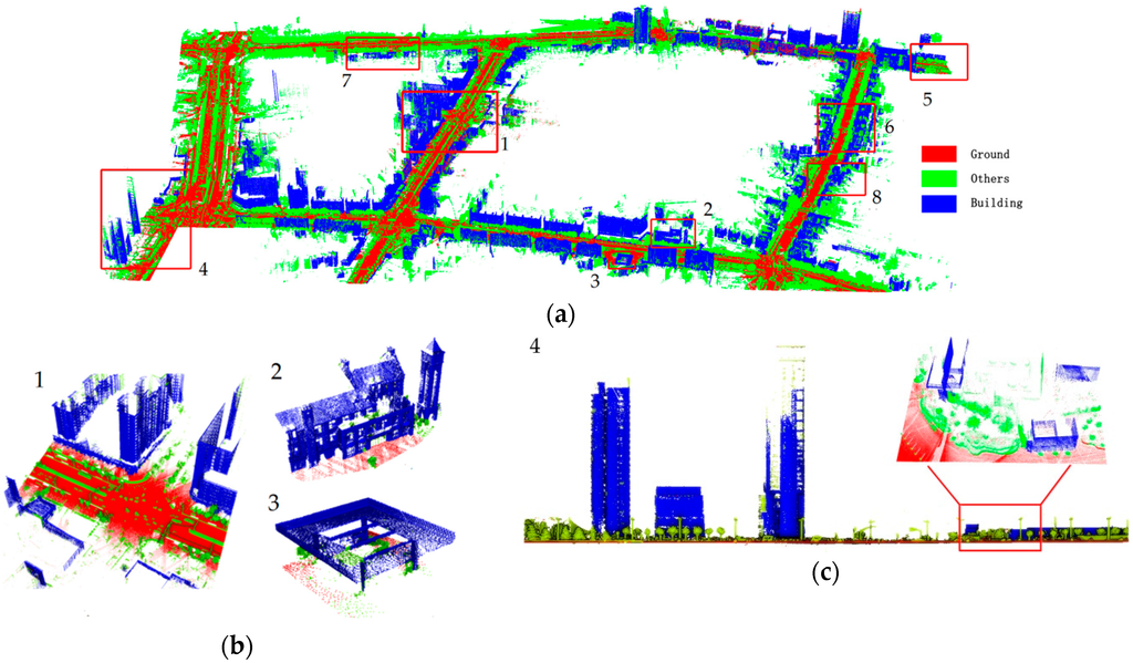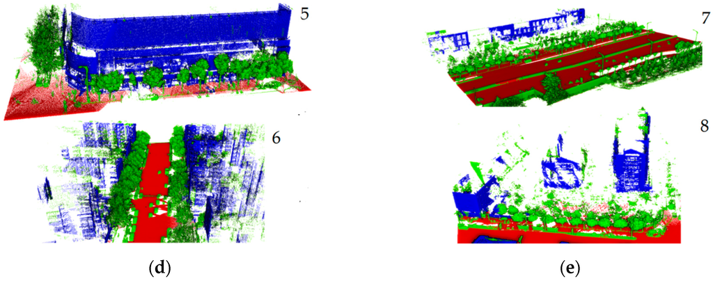 The raw vehicle LiDAR point clouds and aerial orthophotos are used to manually extract the building points. The aerial orthophotos were acquired at the same time period when collecting LiDAR data and they can be matched. The spatial resolution of the aerial orthophotos is 0.2 m and presented in 3 bands red-green-blue (RGB). The extraction results were then used as the validation data. Building point boundaries were connected to determine the building regions as the ground truth, referred to herein as the true building region. Figure 10 illustrates the extraction results of building points. LiDAR points are marked in blue for buildings, red for the ground, and green for the other features. As shown in Figure 10b–d, our method extracted not only high-rise and low-rise buildings, but also buildings with special exteriors or complex structures. Moreover, as shown in Figure 10e, the proposed method recognized buildings with missing parts of facade that were caused by field measurement conditions or equipment factors. The SSW vehicle-borne laser scanning system accomplished the objective of obtaining 192 relatively complete buildings from the experimental area with a total of 235 buildings. A relatively complete building refers to the scanning point cloud of the building with at least two facades. The types of buildings in the study area included low cottages, middle-rise residential buildings, high-rise commercial buildings, and unique structures, such as bell towers and theaters.