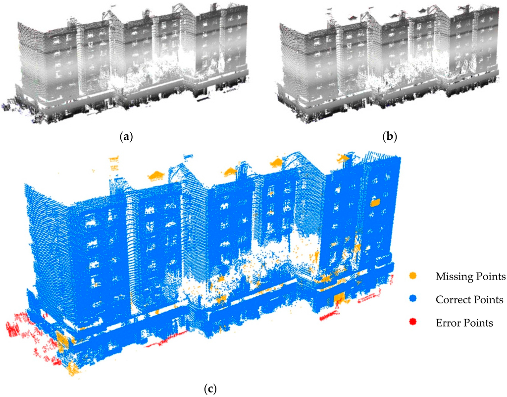 In the evaluation for individual building, where TP is the number of true points belonging to it, FP is the number of wrong points belonging to it, and FN is the number of mis-detected points belonging to it. The extracted building points and true building points are put together. The points of overlapped region are regarded as true points (blue points in Figure 11c); points existing only in the truth regions are deemed misdetections (yellow points in Figure 11c), and points existing only in the extracted regions are considered wrong points (red points in Figure 11c).