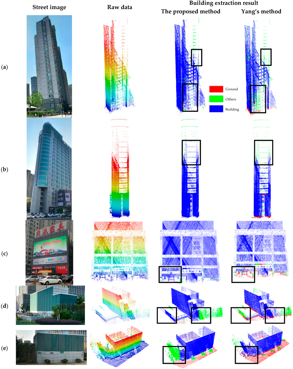 Figure 12 illustrates the comparative experiments result of building extraction by the proposed method and the method of Yang et al. [37]. Region 4 (red rectangle in Figure 9a) is the test area with 5,298,460 points and five buildings. Both methods extract all buildings and no misclassification error has occurred. Figure 12a–c shows that the proposed method can extract more details of the building (see black rectangles), like beam and bay window. Figure 12d,e shows that the proposed method can reduce the error caused by the noise around the building (e.g., bush, tree, and car) and as far as possible to retain the accessory structures of the building at the same time. On the other hand, Yang’s method has wrongly identified the bottom of all the extracted buildings as ground points while the proposed method avoids this mistake.