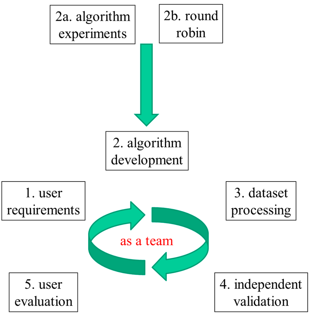 Overview of the cyclic evolution to produce climate quality Climate Data Records (CDRs) starting from user requirements (1) via algorithm development (2); dataset processing (3); independent validation (4) and user evaluation (5). In preparation for algorithm development, algorithm experiments (2a) and round robin exercises (2b) may be conducted.