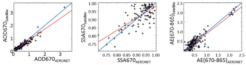 Iterative algorithm development and independent validation assure transparent and credible proof of any changes made. The cycle improves the individual algorithms while producing a convergence of their datasets. Our validation is based on comparison to independent data from the AERONET [34] and MAN [35] sun photometer networks [36]. The results are first validated for L2 products. A spatial threshold of +/−35 km and a time frame of +/−30 min is used to match satellite pixels with the independent data.