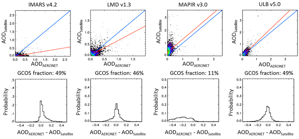 A CDR is nominally required to contain a time series of 30 or more years. As individual satellite missions have shorter lifetimes (e.g., designed for 5 years, but may last 15), a CDR must be built from multiple data records. Even though operational systems assure continuity by launching a series of identical sensors, their characteristics may change due to large mechanical stresses during launch and post-launch optical degradation or orbital drift. If similar, but not identical, instruments are used then the impact of the differences needs to be assessed in the derived aerosol products. For example, [7] studied a three-year overlap characterizing the AOD time series of the NASA (National Aeronautics and Space Administration) MODIS (Moderate Resolution Imaging Spectro-Radiometer) and NOAA (National Oceanic and Atmospheric Administration) VIIRS (Visible Infrared Imaging Radiometer Suite) instruments when applying both identical and distinct algorithms.