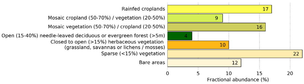 We used as a reference the 2009 global land cover map (ESA GlobCover Project) generated with the radiometric data collected by the Medium Resolution Imaging Spectrometer (MERIS) on board the ENVISAT satellite [43]. The original radiometric data have a spatial resolution of 300 m, which was aggregated to a 1 km spatial resolution for consistency with the precipitation and NDVI data using the majority method. The original land cover map considers 23 different land cover classes of which 14 are present in our study region (Figure 2). Only the seven land cover classes (Figure 3) that have a fractional abundance >1% and together cover 90% of our region were considered for analysis of the results of time series analysis.