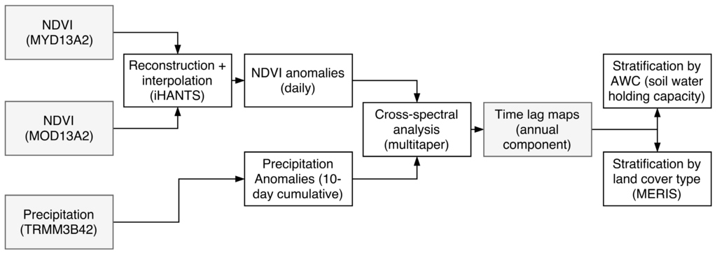 The methodology for producing time lag estimates of the annual component is presented in Figure 5. It aims at addressing contamination in NDVI data and preparation of anomaly datasets from the 10 years of precipitation and NDVI data before applying the cross-spectral analysis.